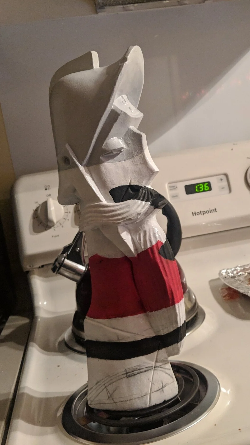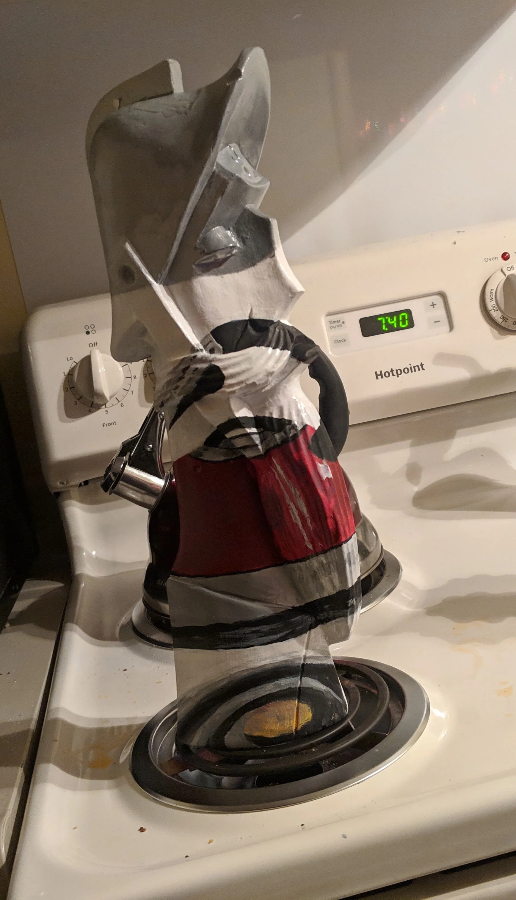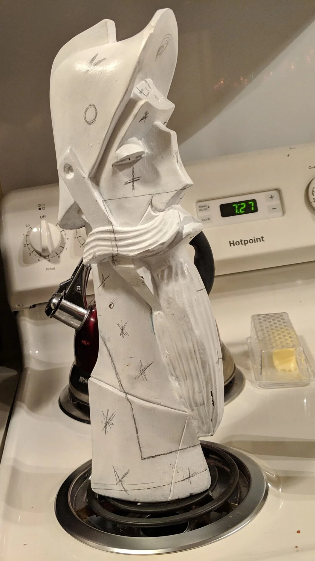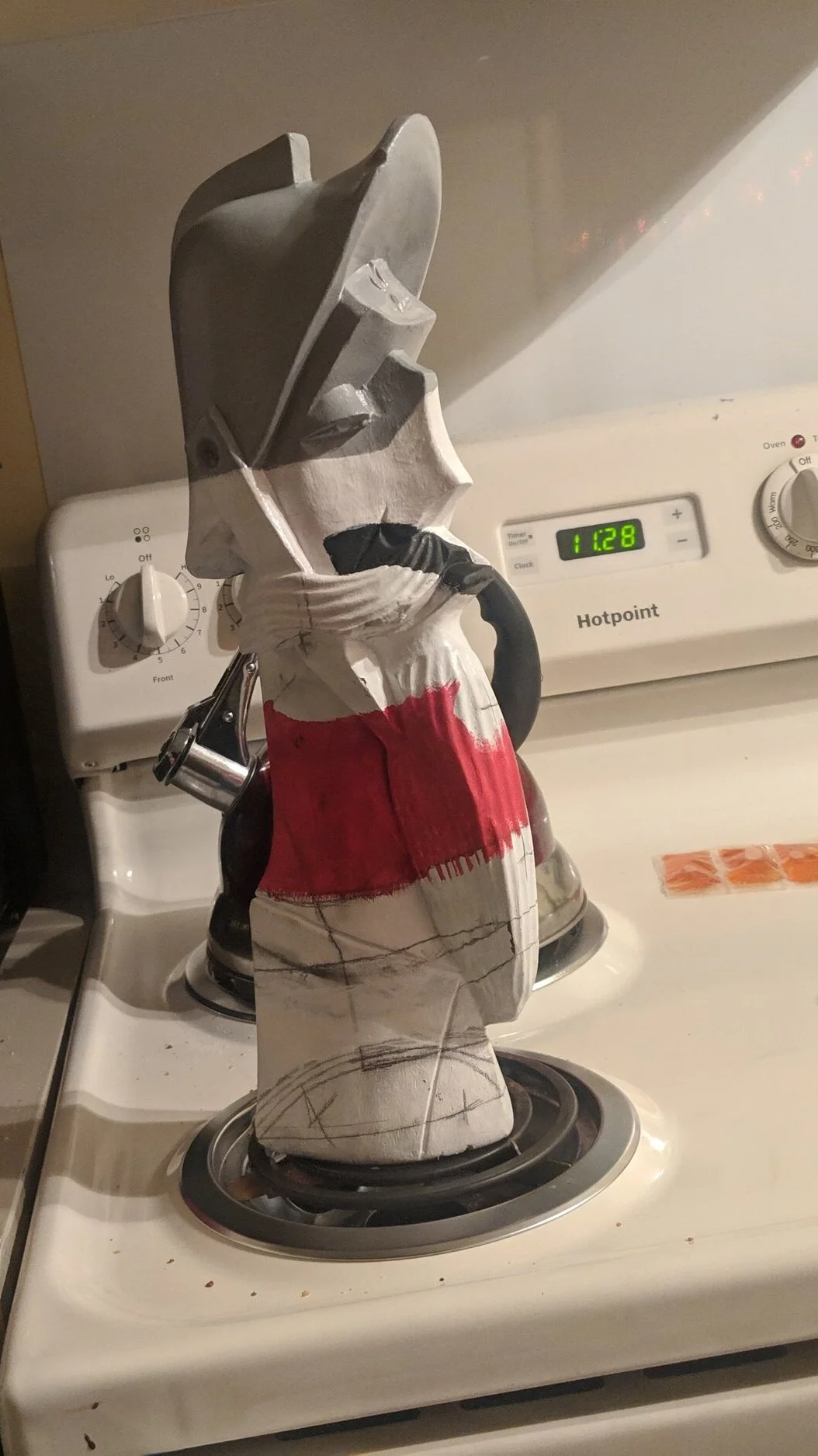 This was an assignment I put off until the day after it was due. I just explained to my teacher I was having some bad mental health days and I’d finish it in one night if I could still get a grade, even if it’s lower. So I whipped out the paints and started this odd masterpiece. I had this object painted white and drew some shapes on it to mark where I need to draw. Once again I popped into Photoshop and put the picture to the left with a semi blank wood sculpture and turned down the opacity. I then closely looked at photoshop to get my lines right and drew the outline. I want to note my camera was in one place the entire night, to not throw off the painting. Also the time to my left and right are both am, it was a long night.