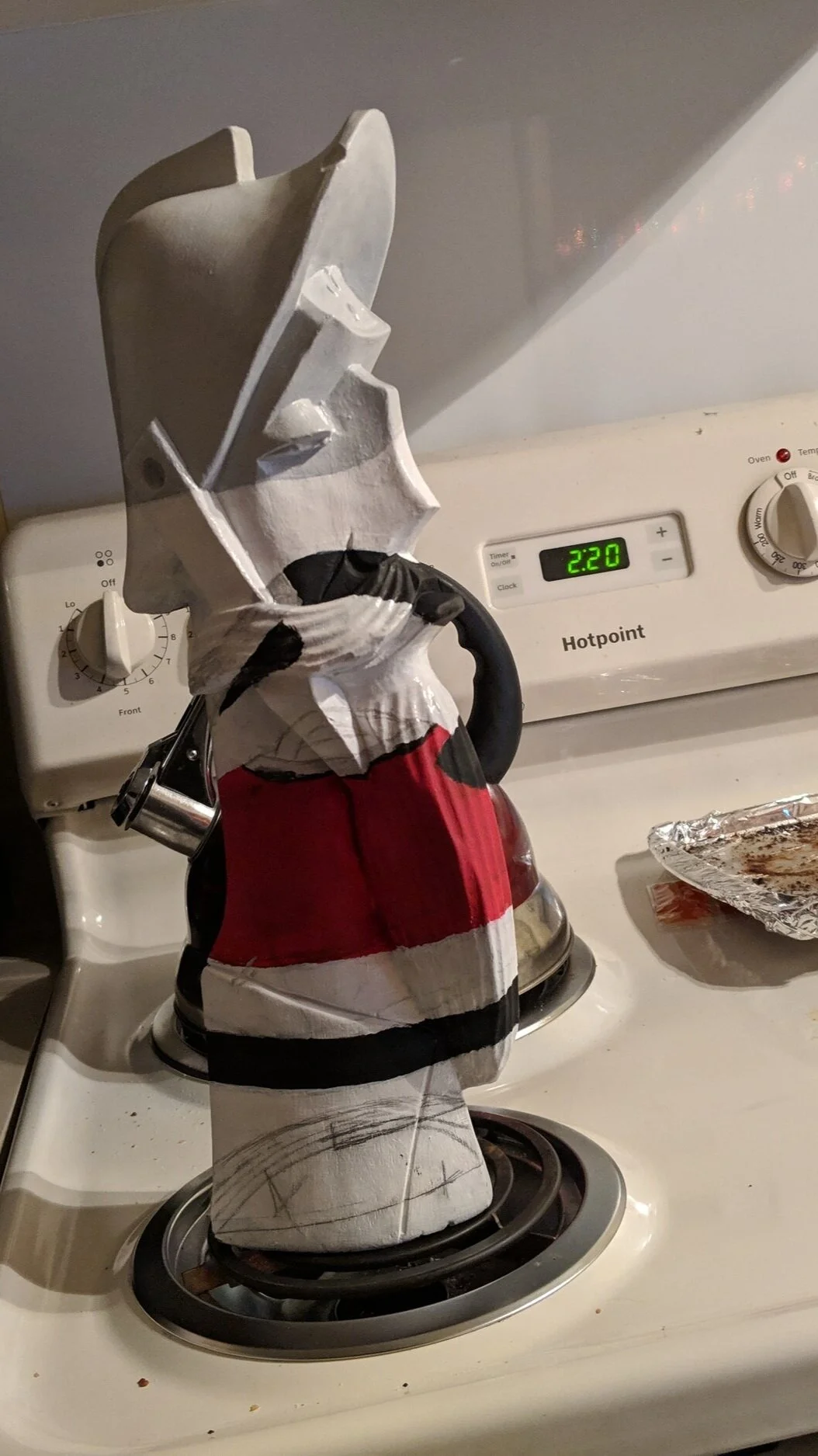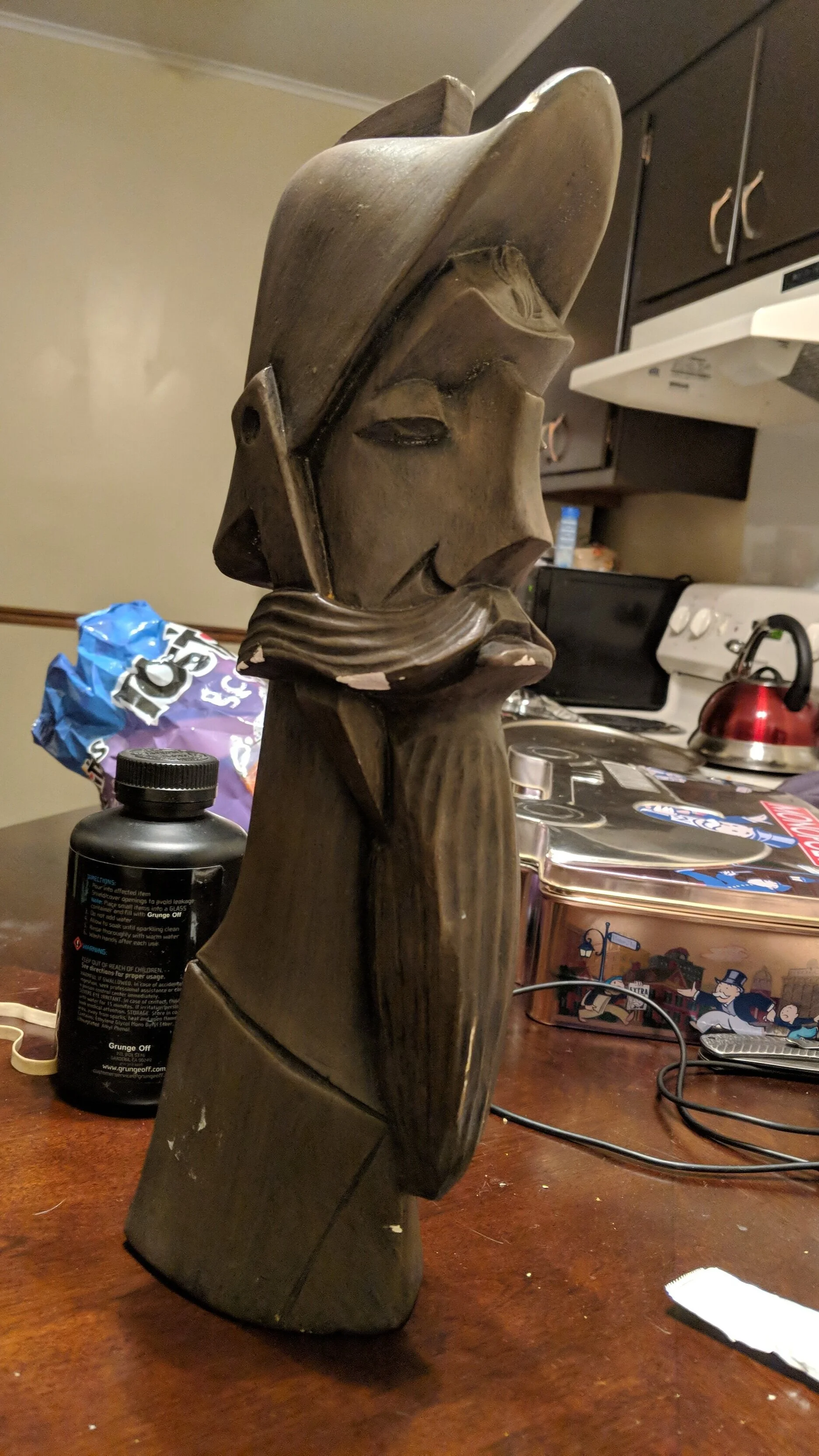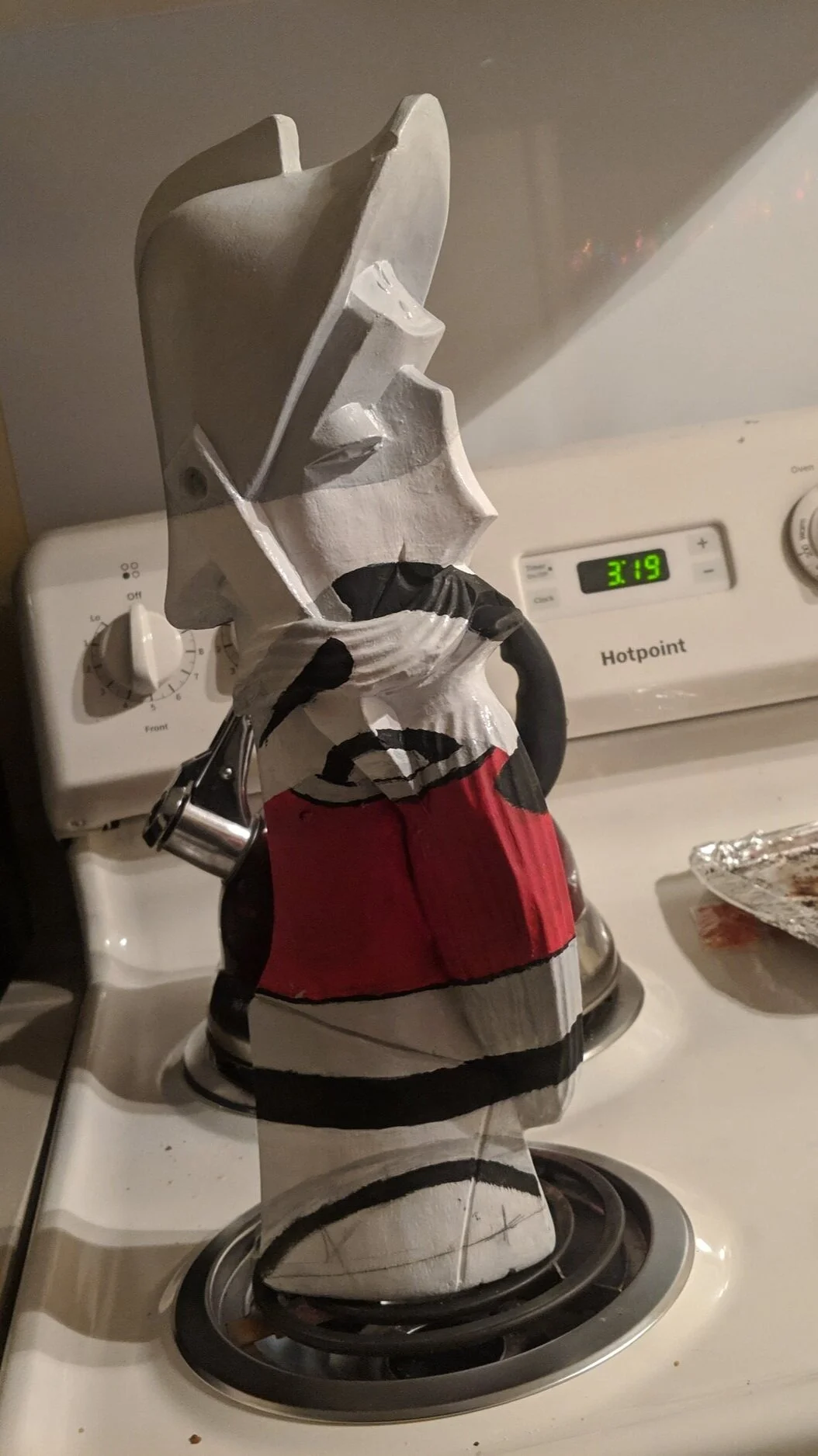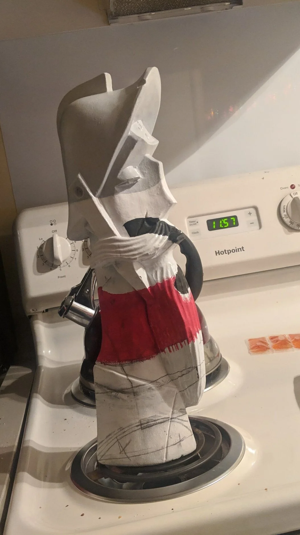 This was an assignment I put off until the day after it was due. I just explained to my teacher I was having some bad mental health days and I’d finish it in one night if I could still get a grade, even if it’s lower. So I whipped out the paints and started this odd masterpiece. I had this object painted white and drew some shapes on it to mark where I need to draw. Once again I popped into Photoshop and put the picture to the left with a semi blank wood sculpture and turned down the opacity. I then closely looked at photoshop to get my lines right and drew the outline. I want to note my camera was in one place the entire night, to not throw off the painting. Also the time to my left and right are both am, it was a long night.