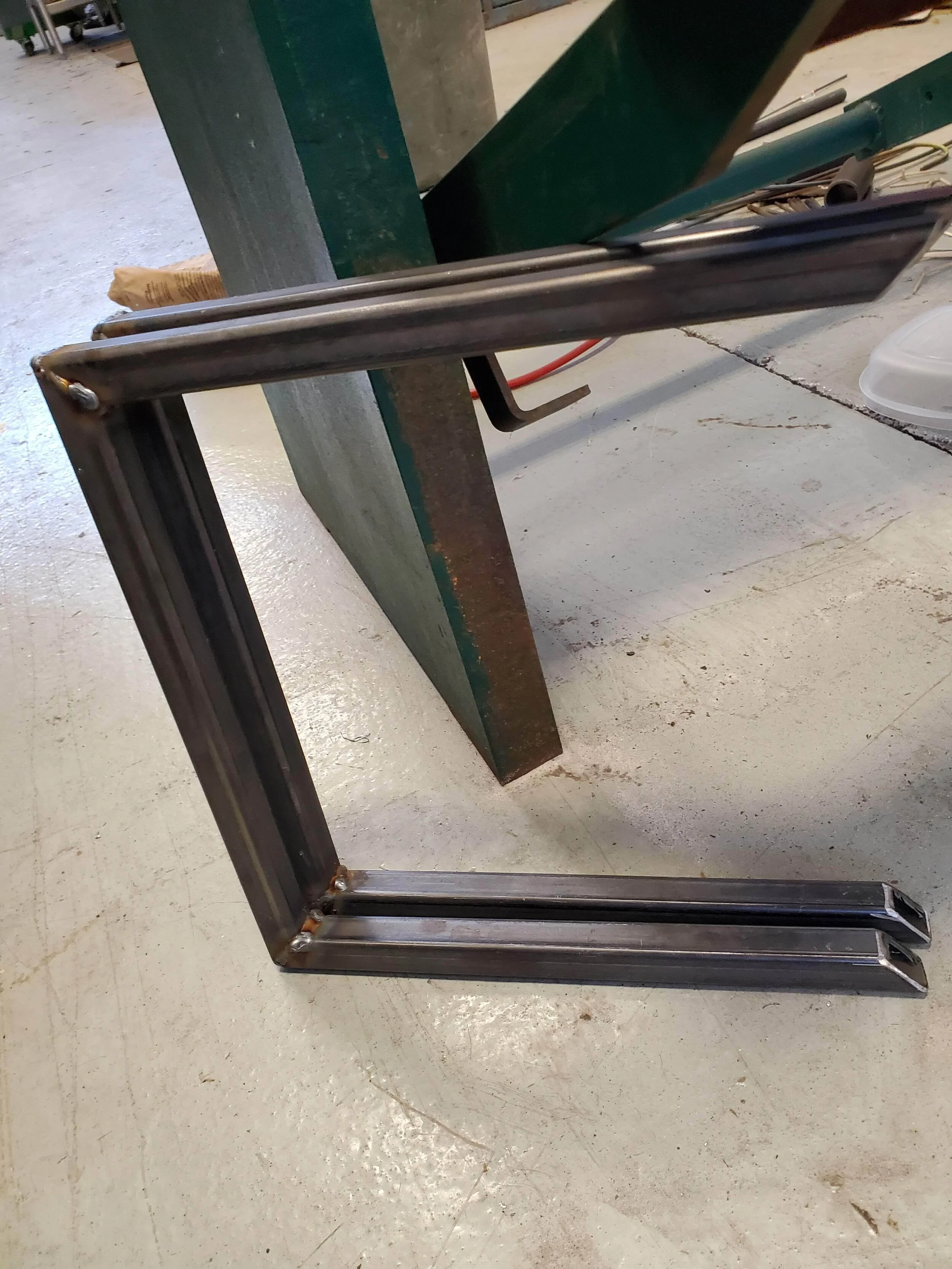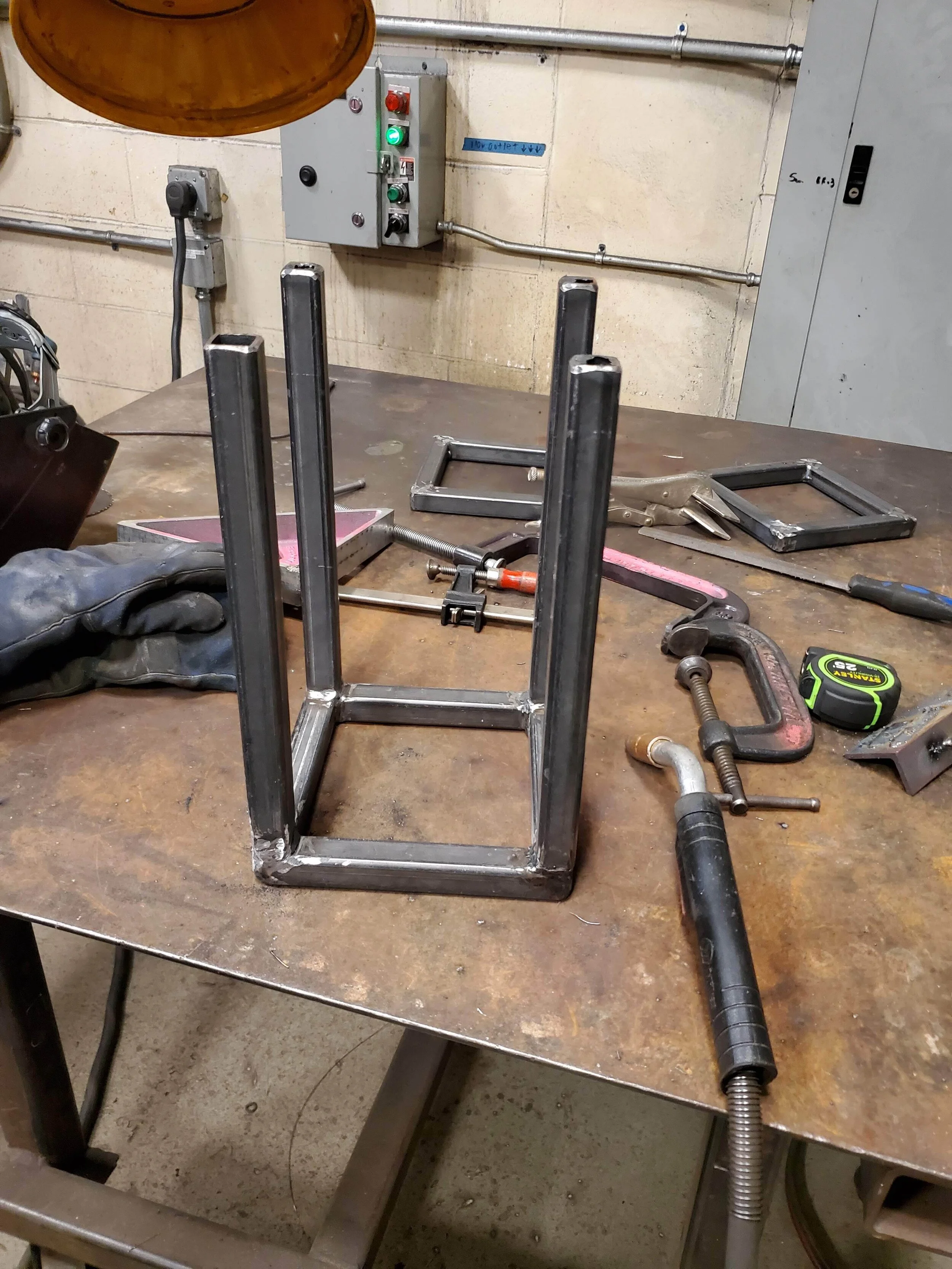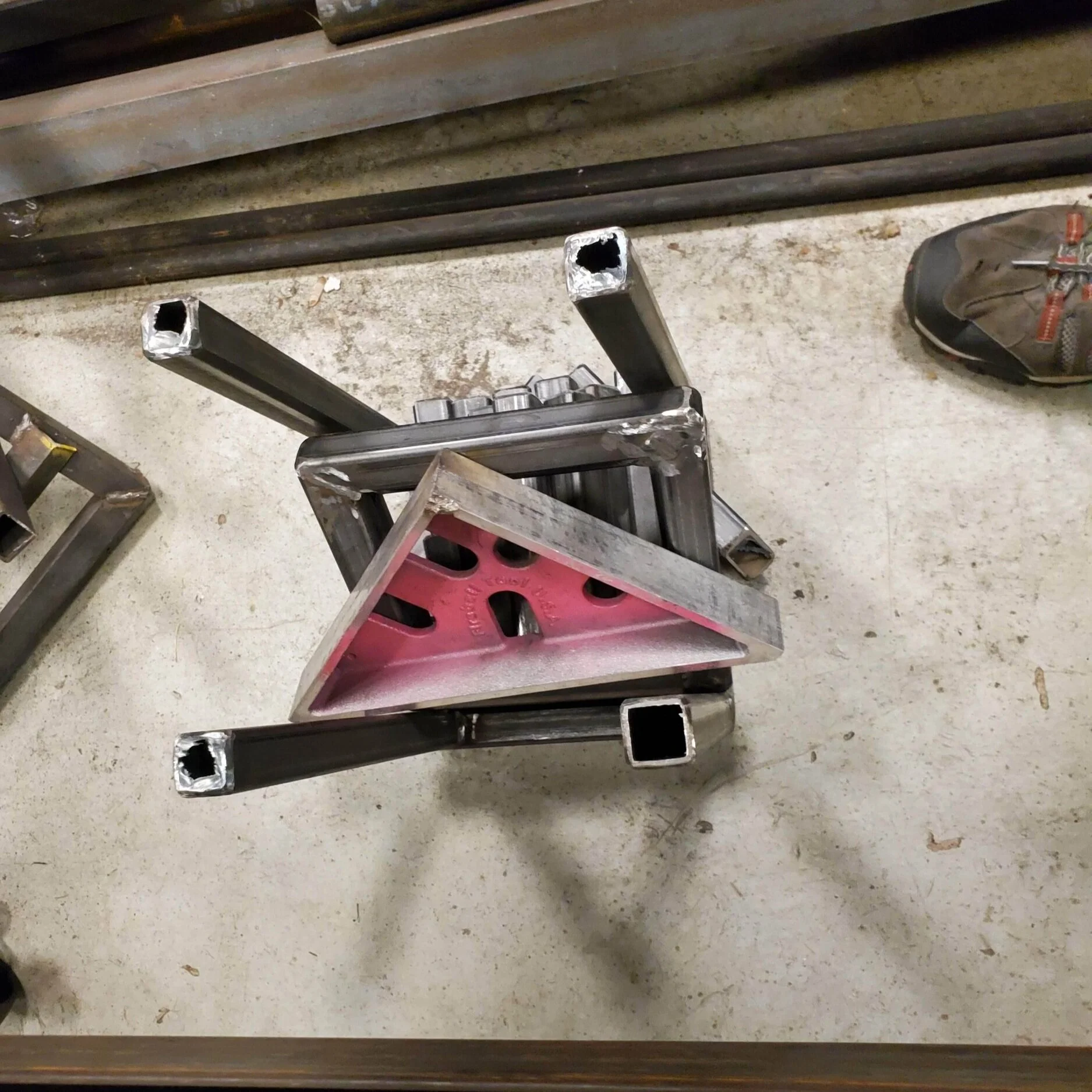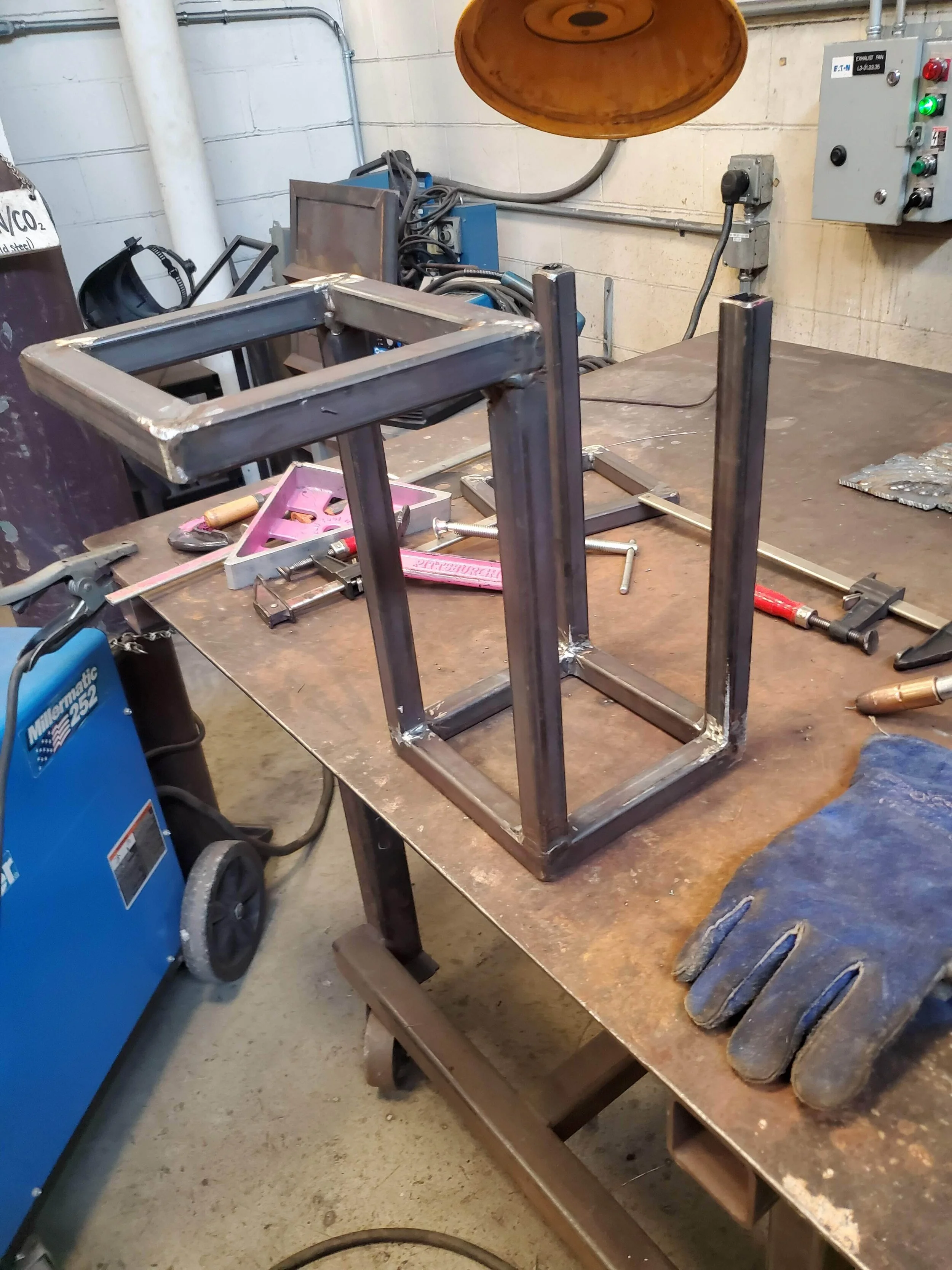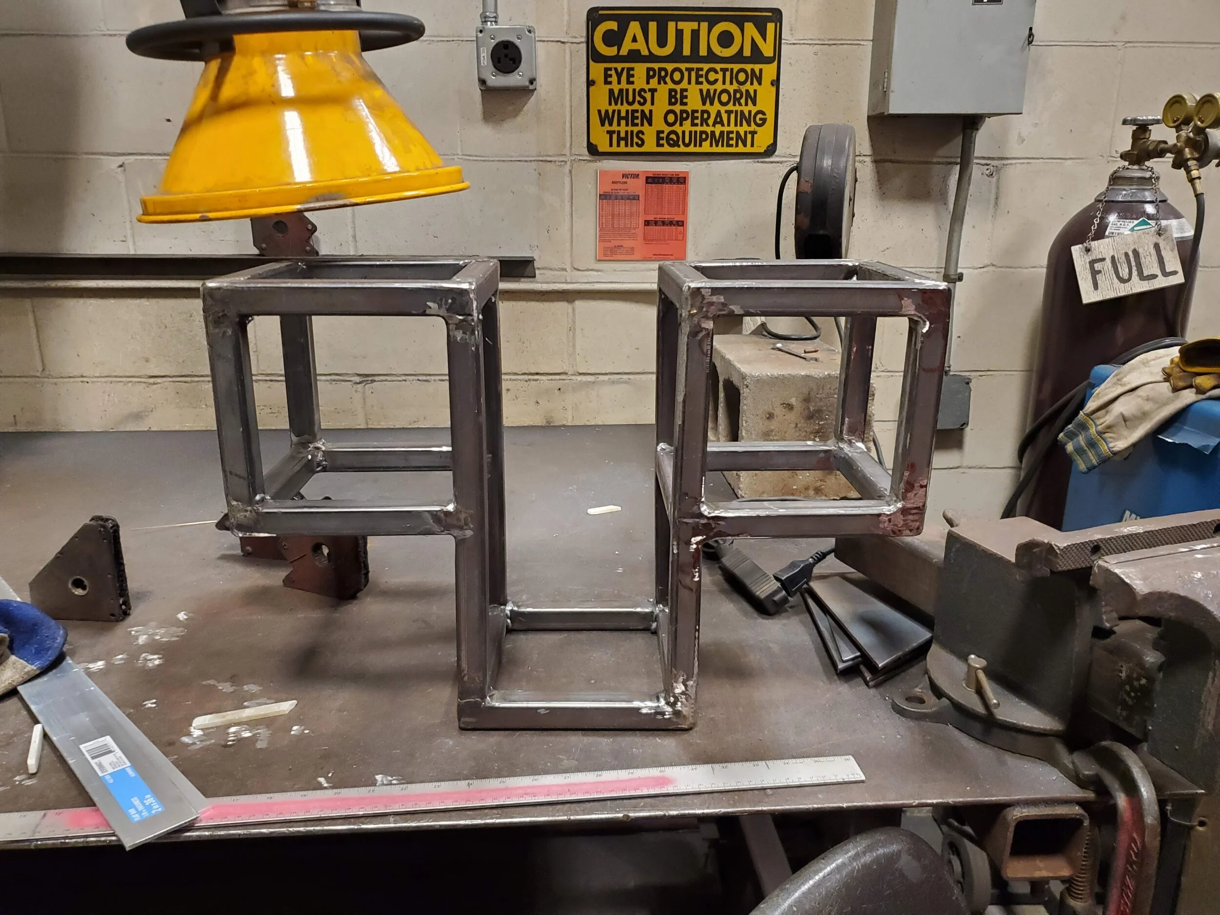 I came in Saturday at 11am, when the lab opened, and spent the first 5 hours cutting the pieces and grinding them, prepping to weld. I went home, showered off layers of metal dust, and came back at 7pm for 5 more hours of lab time. During the night period I started welding and got the base as square as I could possibly, I struggled to get them square at times because the metal moves as it cools down, but I was able to square it up with heavy use of vice's.