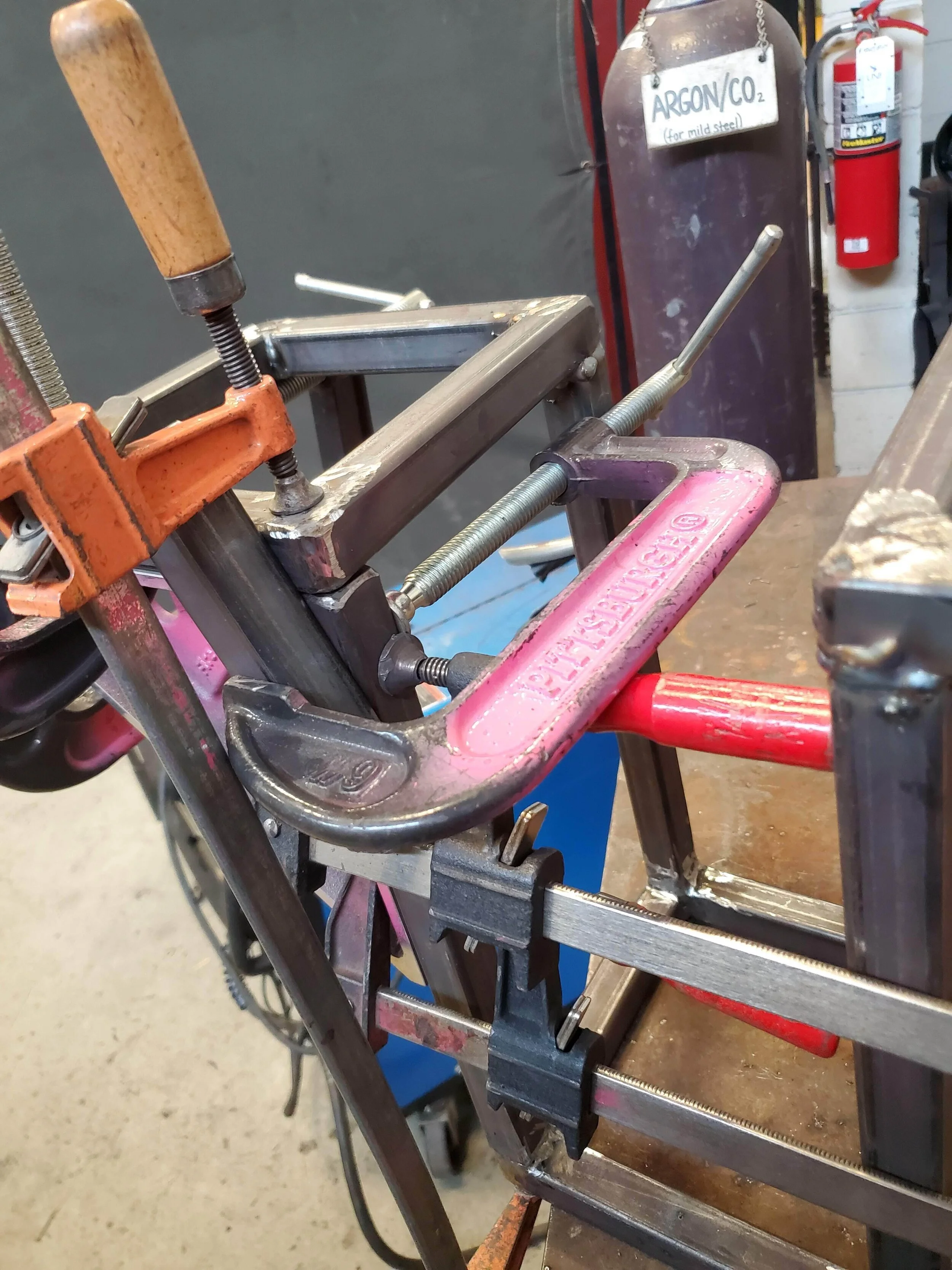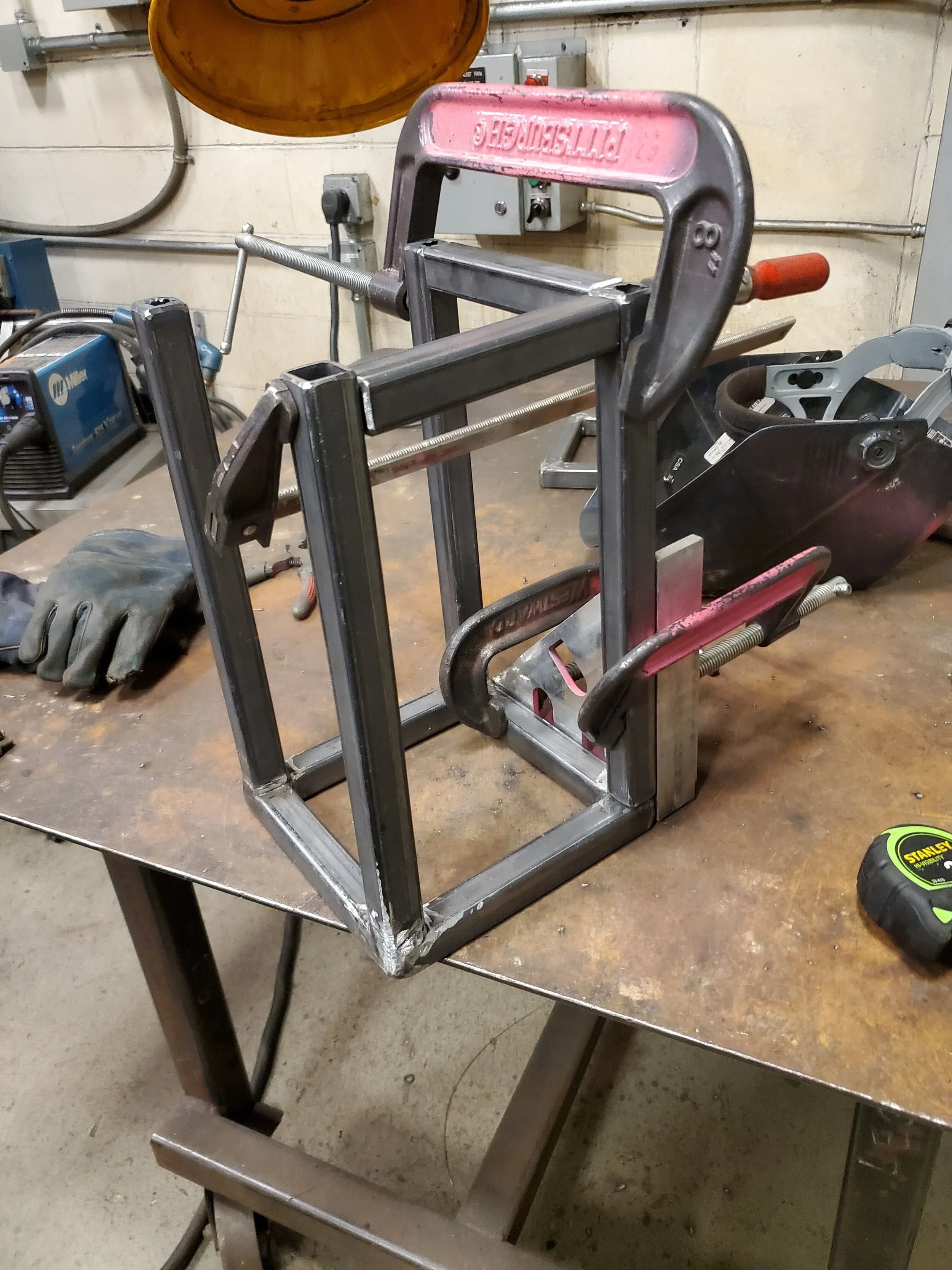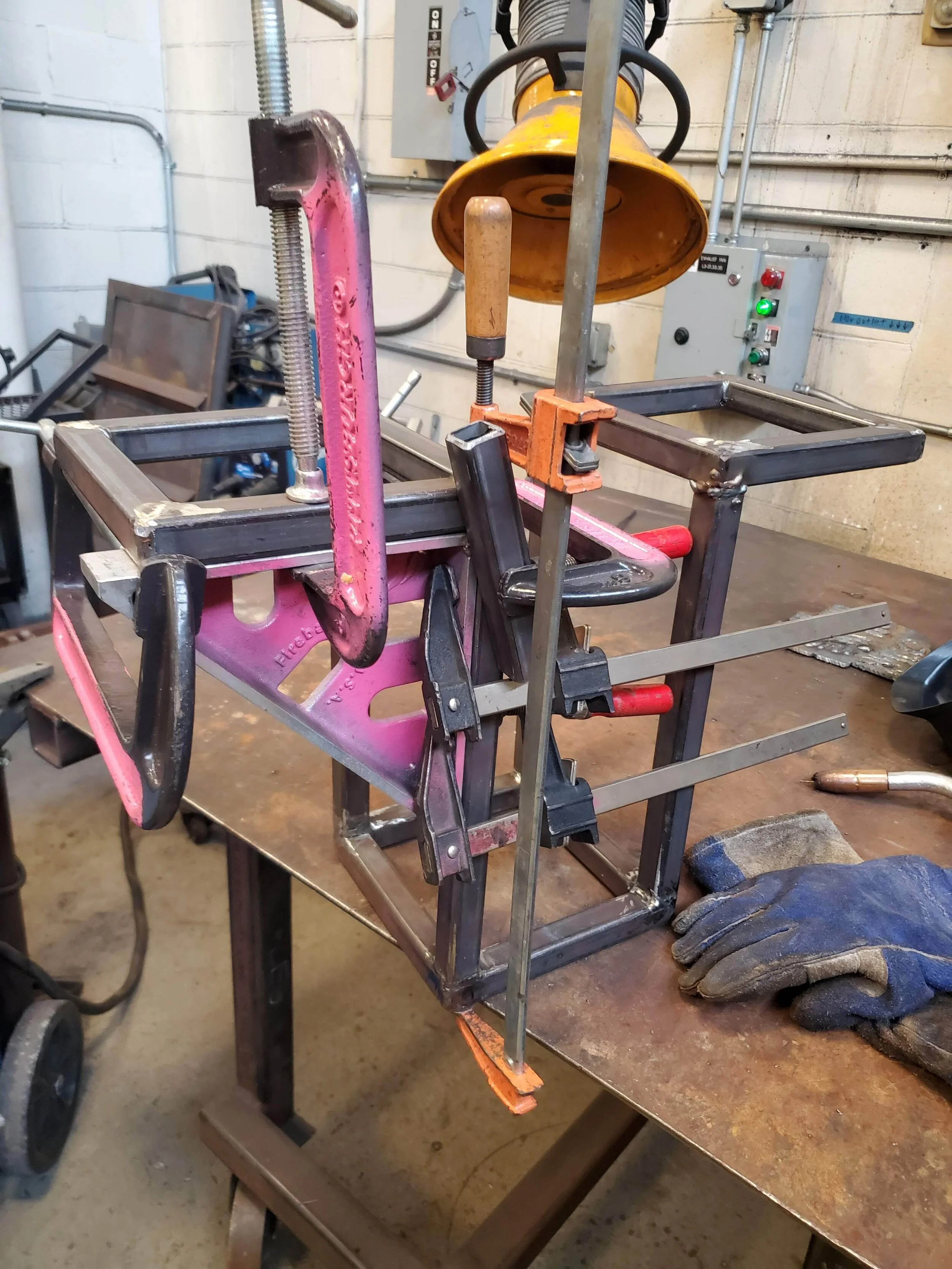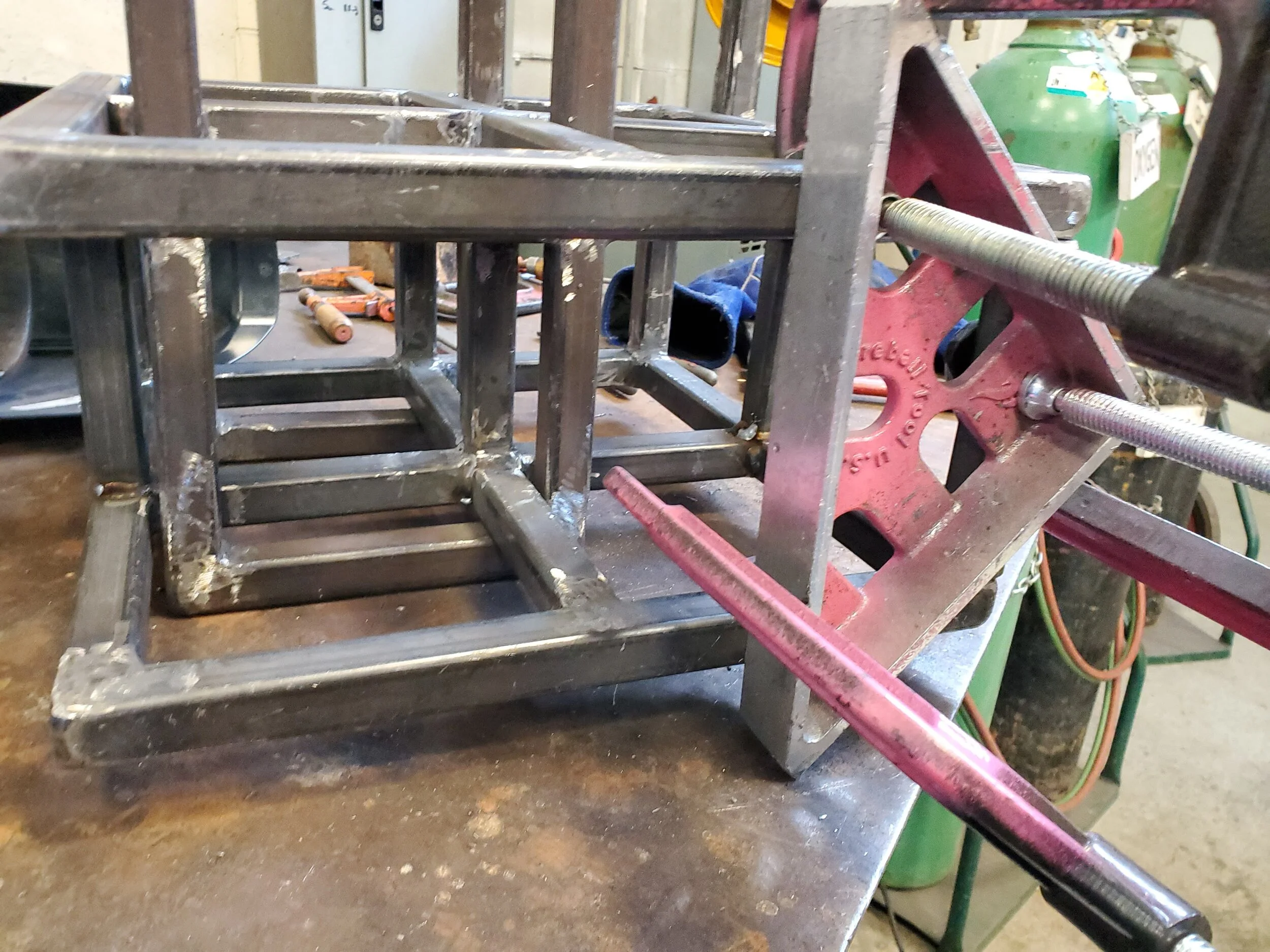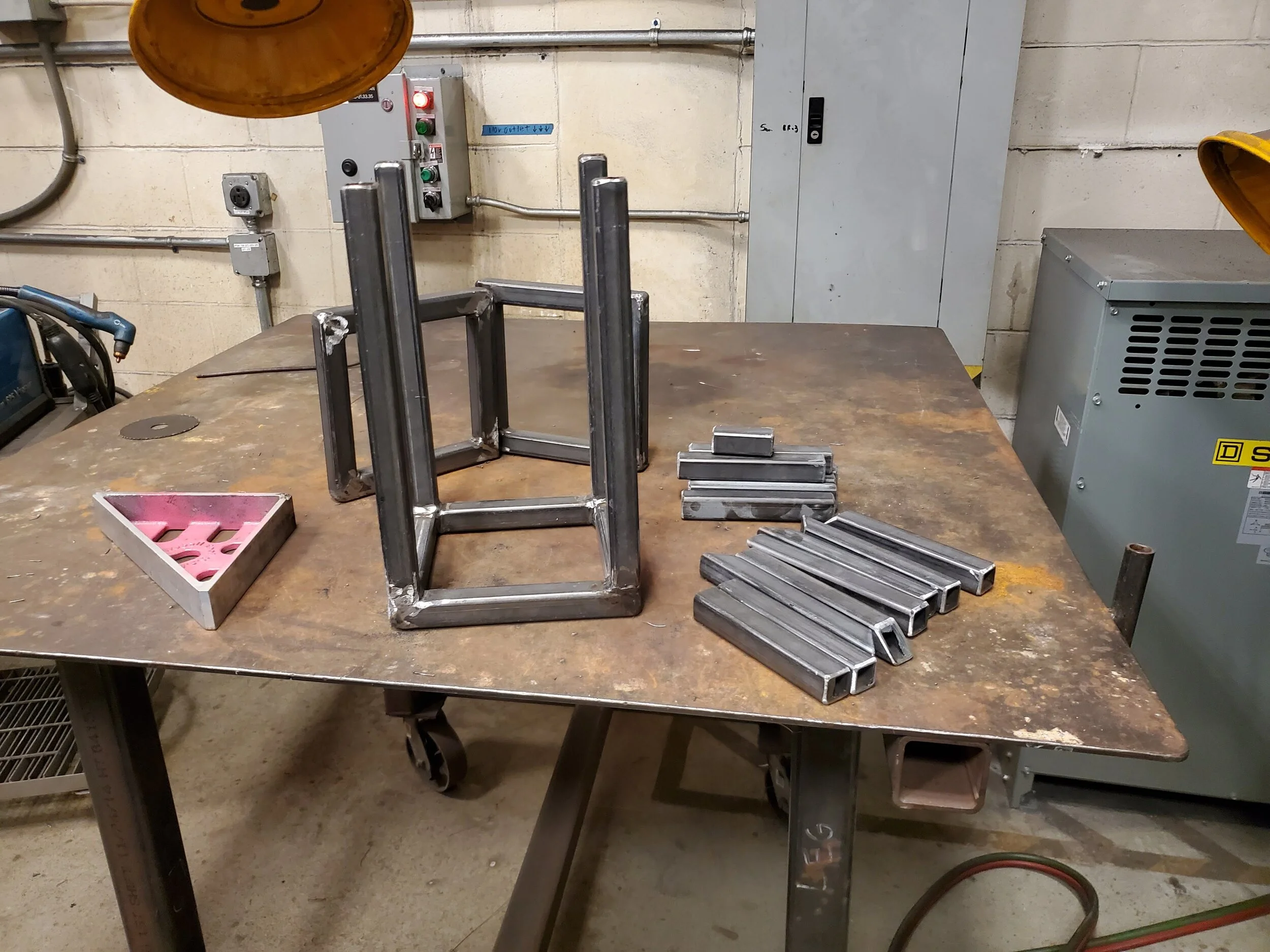 I came in Saturday at 11am, when the lab opened, and spent the first 5 hours cutting the pieces and grinding them, prepping to weld. I went home, showered off layers of metal dust, and came back at 7pm for 5 more hours of lab time. During the night period I started welding and got the base as square as I could possibly, I struggled to get them square at times because the metal moves as it cools down, but I was able to square it up with heavy use of vice's.