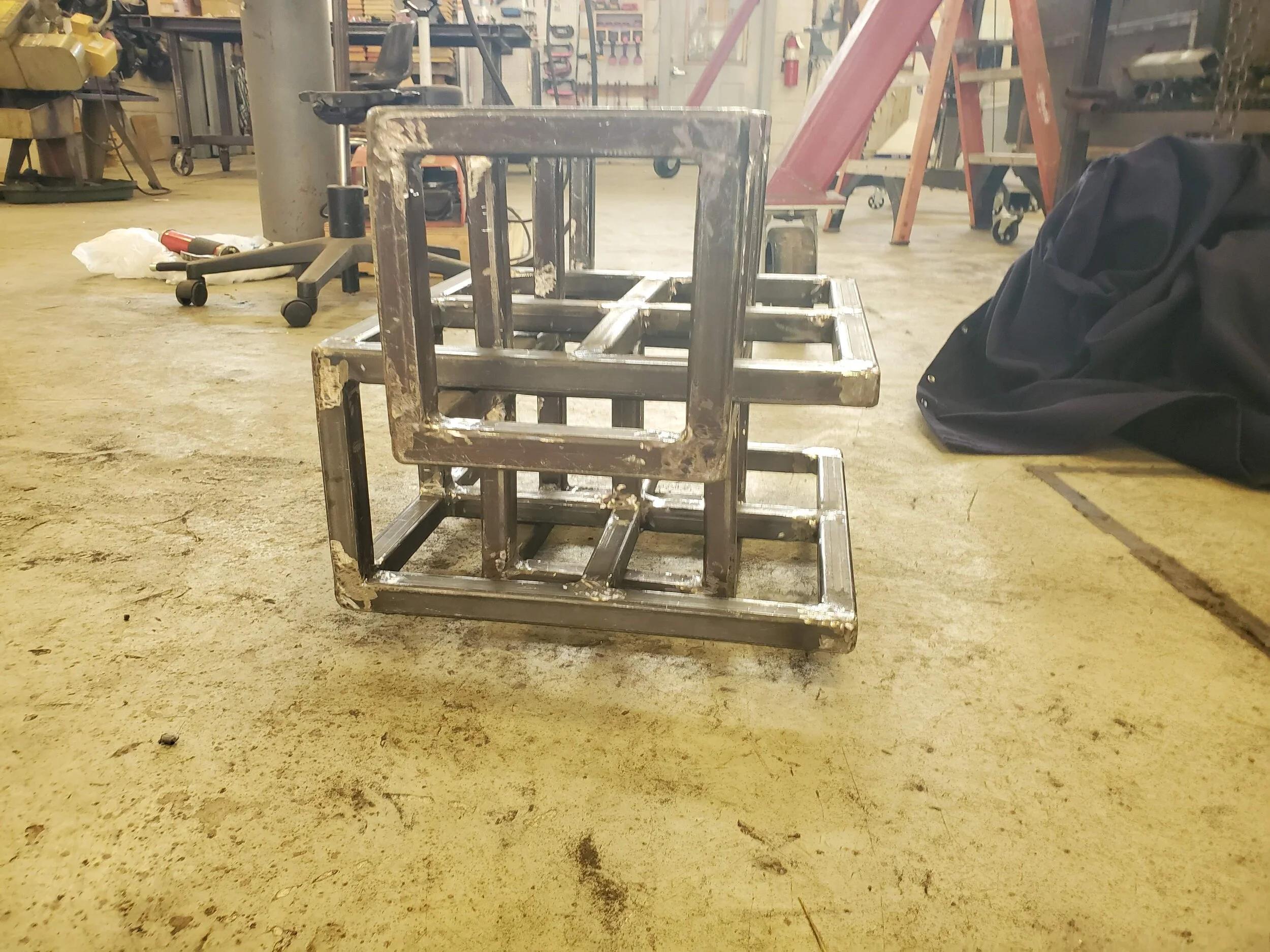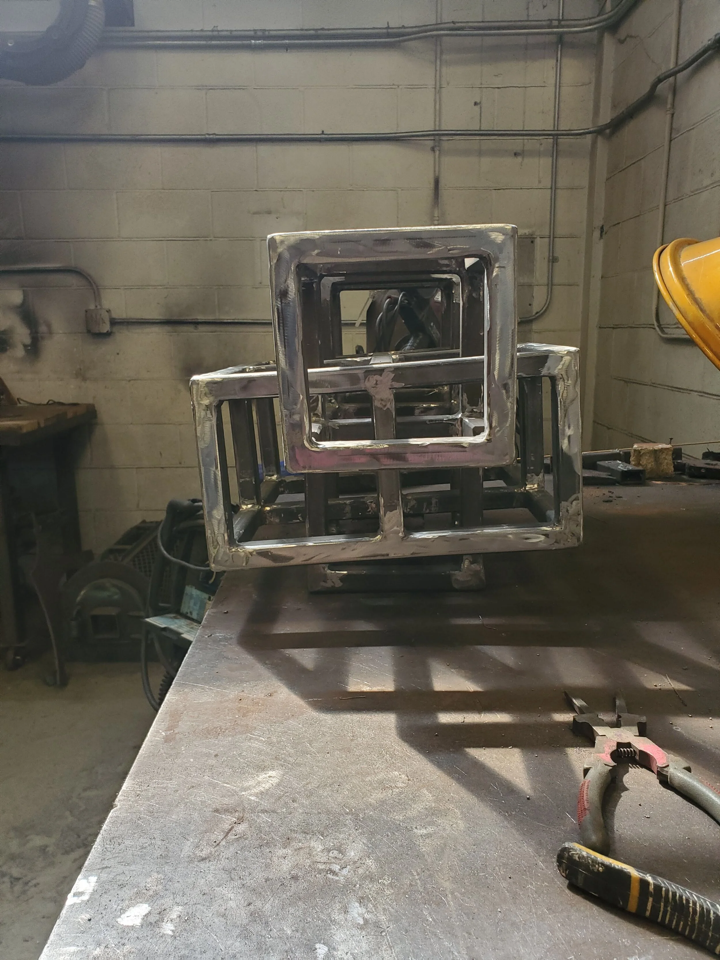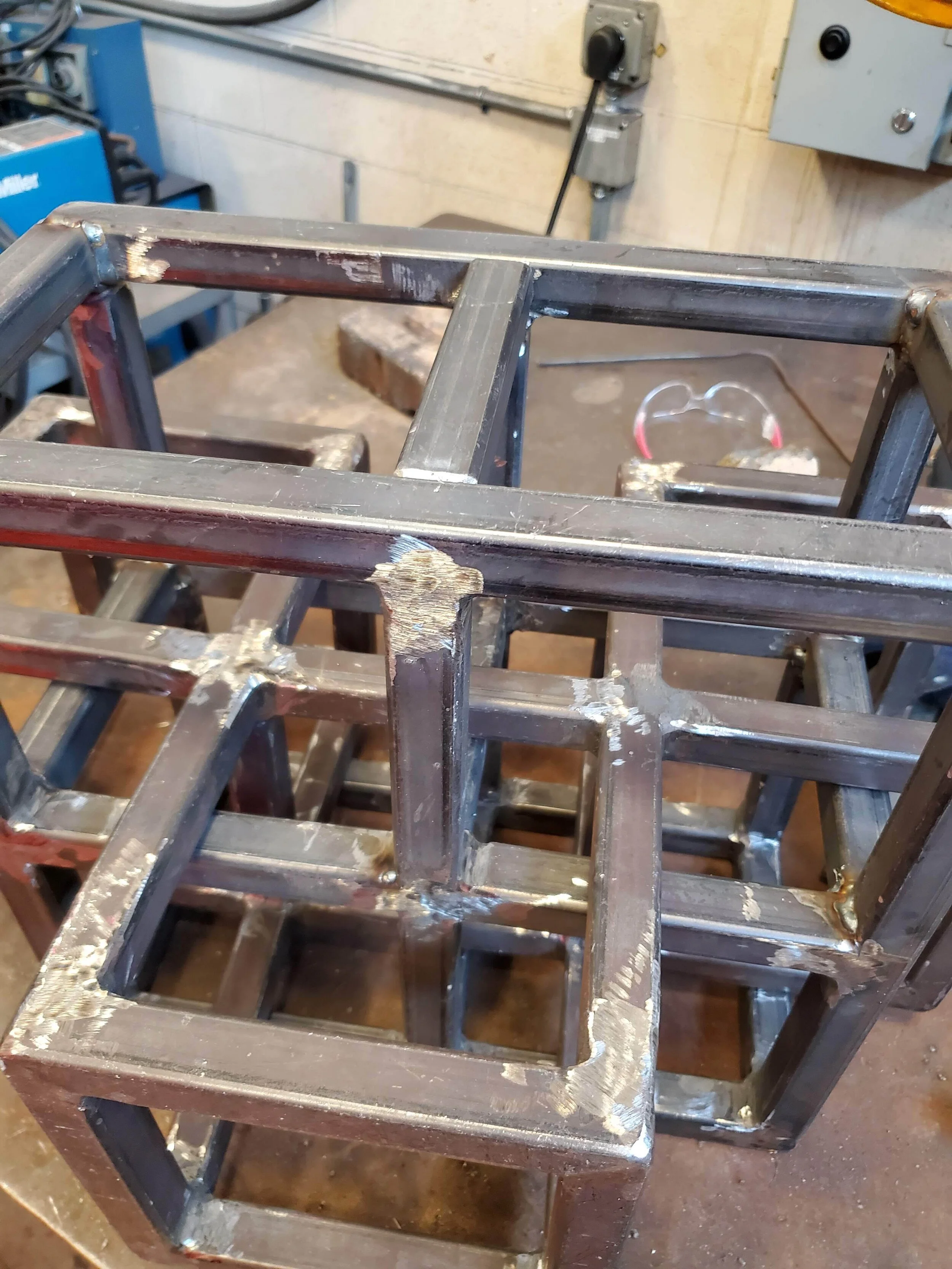 By this point I feel like a professional welder, so I had an easier time cutting and grinding the pieces for the next 4 cubes. I guess I got really into it this day because I got there at 9am for class and left at 7pm without even a snack break. I spent the morning section cutting, grinding, and setting up the base for the new cubes. After I got the bases down I wanted to be careful and plan each on out, so I’d be able to get in with a grinder and clean up. I started with the pieces that don’t intersect first to give it a solid starting point. After welding, grinding, and squaring that piece, I set it in the 3 cubes and started the first intersecting pipe, no going back now. I had to use a hammer to get some pieces in and had to fill others with mig wire, so my measurements may have been off by a few millimeters here and there. I got all but 5 bars of the final 4 cubes done, but I felt exhausted and needed food, so it rested in my head incomplete for the day while I drove off and got some Burger King.