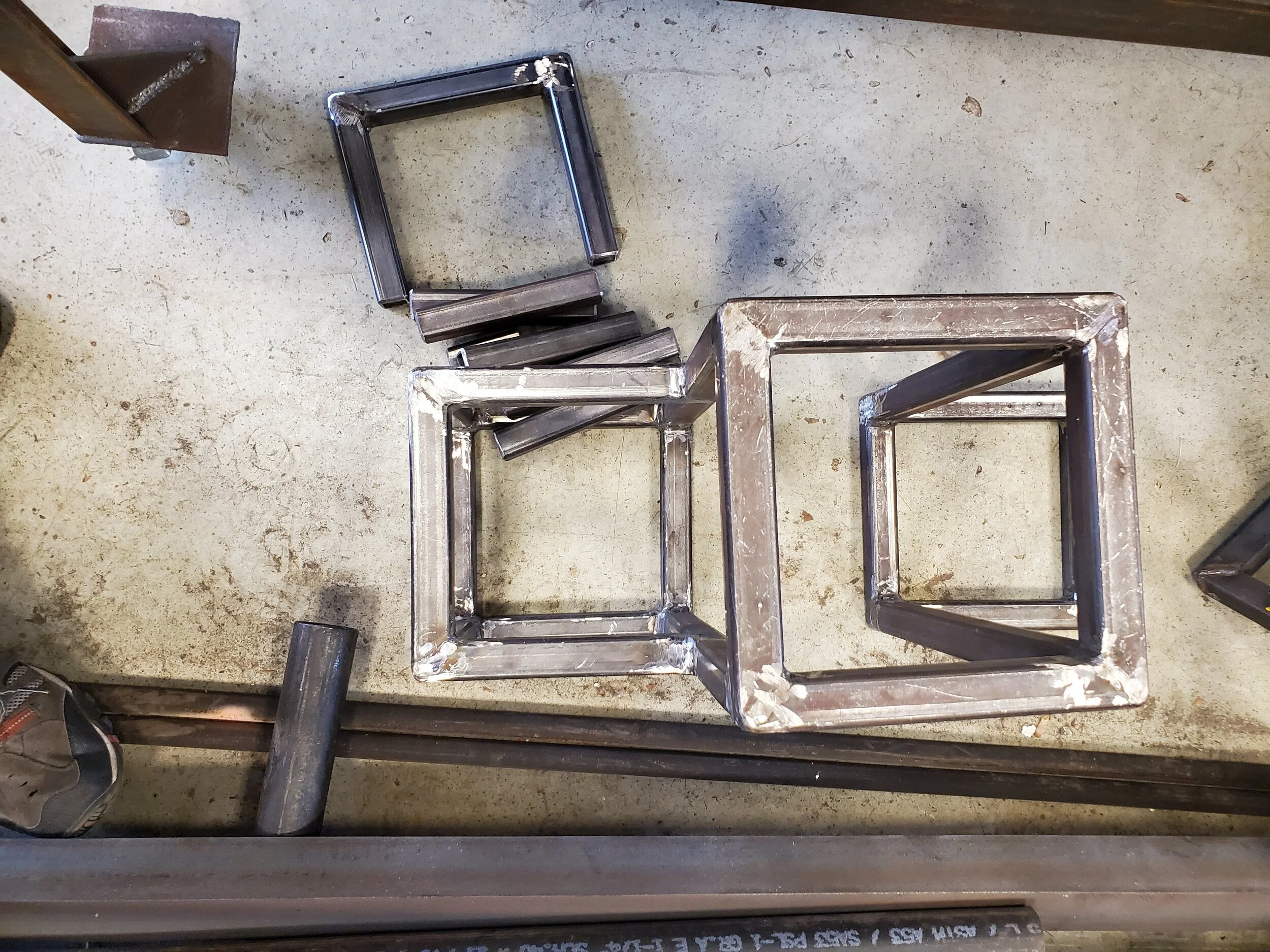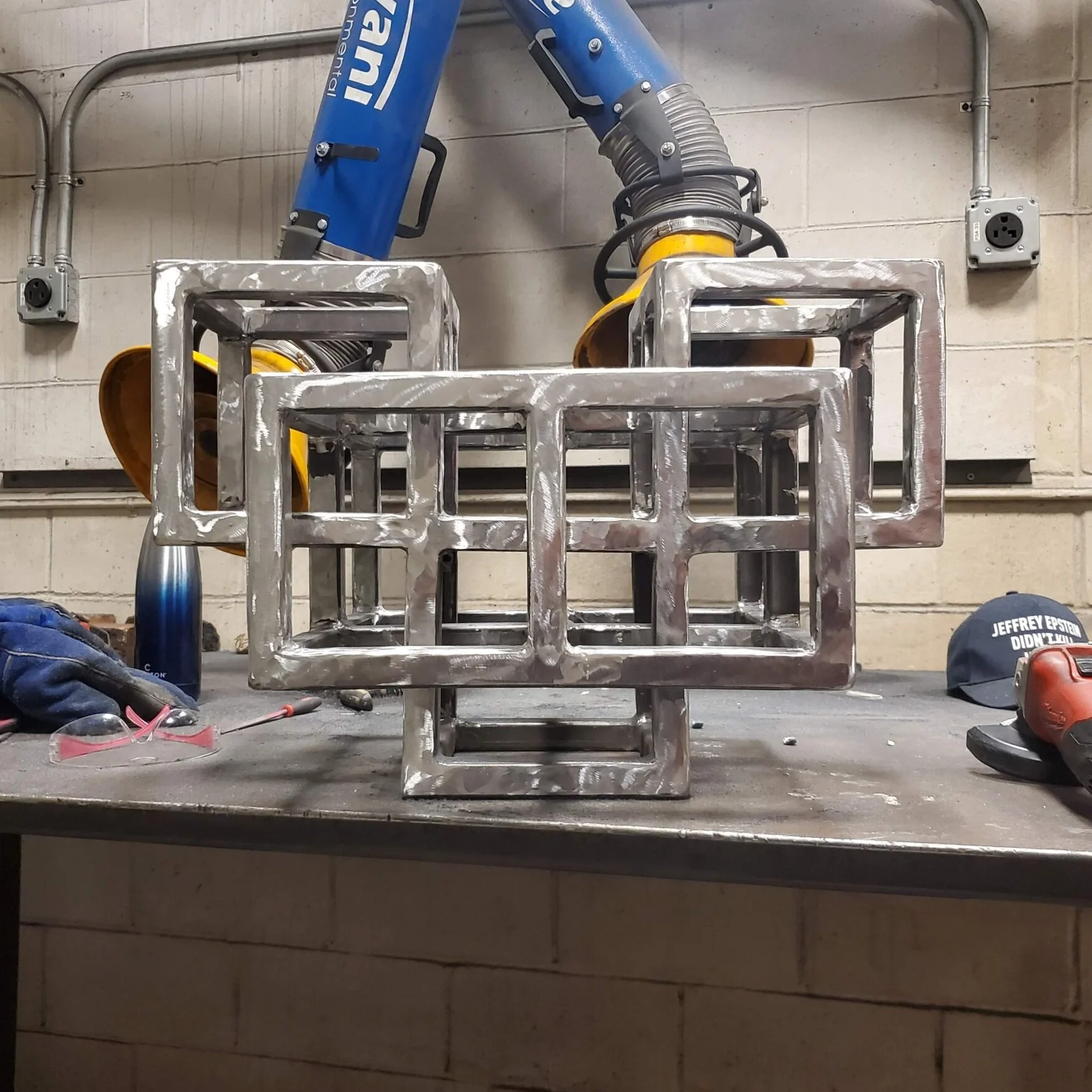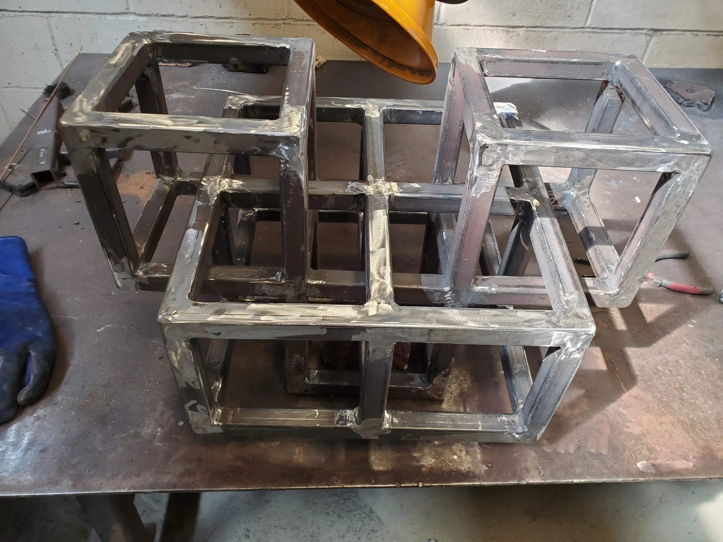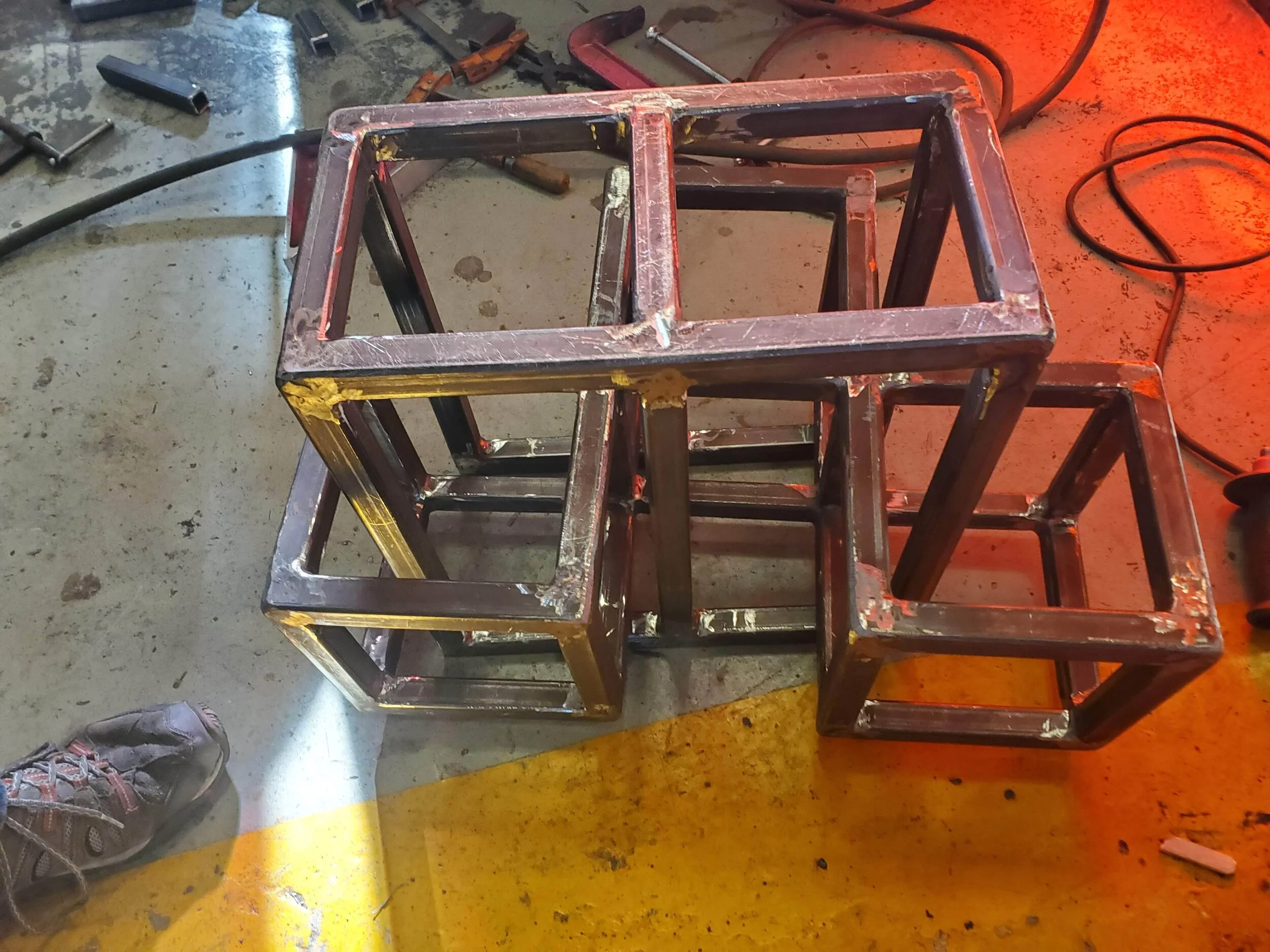 I started with two ideas in my head the first being a fully functional Skateboard, but my teacher advised that the engineering needed may be a little too advance, so I went to my backup, a cube sculpture. I had two references in mind, one being a picture my dad sent me from a metal shop near him and a cube optical illusion both displayed below. I learned how to weld for this project and it was honestly an incredibly fun experience. At first I was having issues making clean welds, but halfway through the 3rd cube something clicked and I started zipping away. I started with a 3D model made in Fusion 360, then sketched out each piece needed, with measurements, on paper. After doing the math I discovered my original larger version would have costed well over $100 and that is pretty out of my broke college student budget. So I halved the scale and it was more affordable, but I still wanted it to be as big as I could afford. After several calls to Scott Bolt, I got prices for different lengths and sizes and I built three or four more models in Fusion 360 to see a “realistic” version of my idea. I wanted to remain chunky but balanced so after my original 12 inch design I fell on 8 inch cubes with 1 inch square tubing, 1/8th inch thick because I wanted room to mess up, just in case. I rented a truck to pick the metal up because I was afraid I wouldn’t be able to fit in my car, I just didn’t do any math in my head and could have easily fit 8, 6 foot tubes in my car. I knew I could fit the Tubes in my car because I did it to take them to school, so that was a very wasted 60 dollar addition to the budget.
