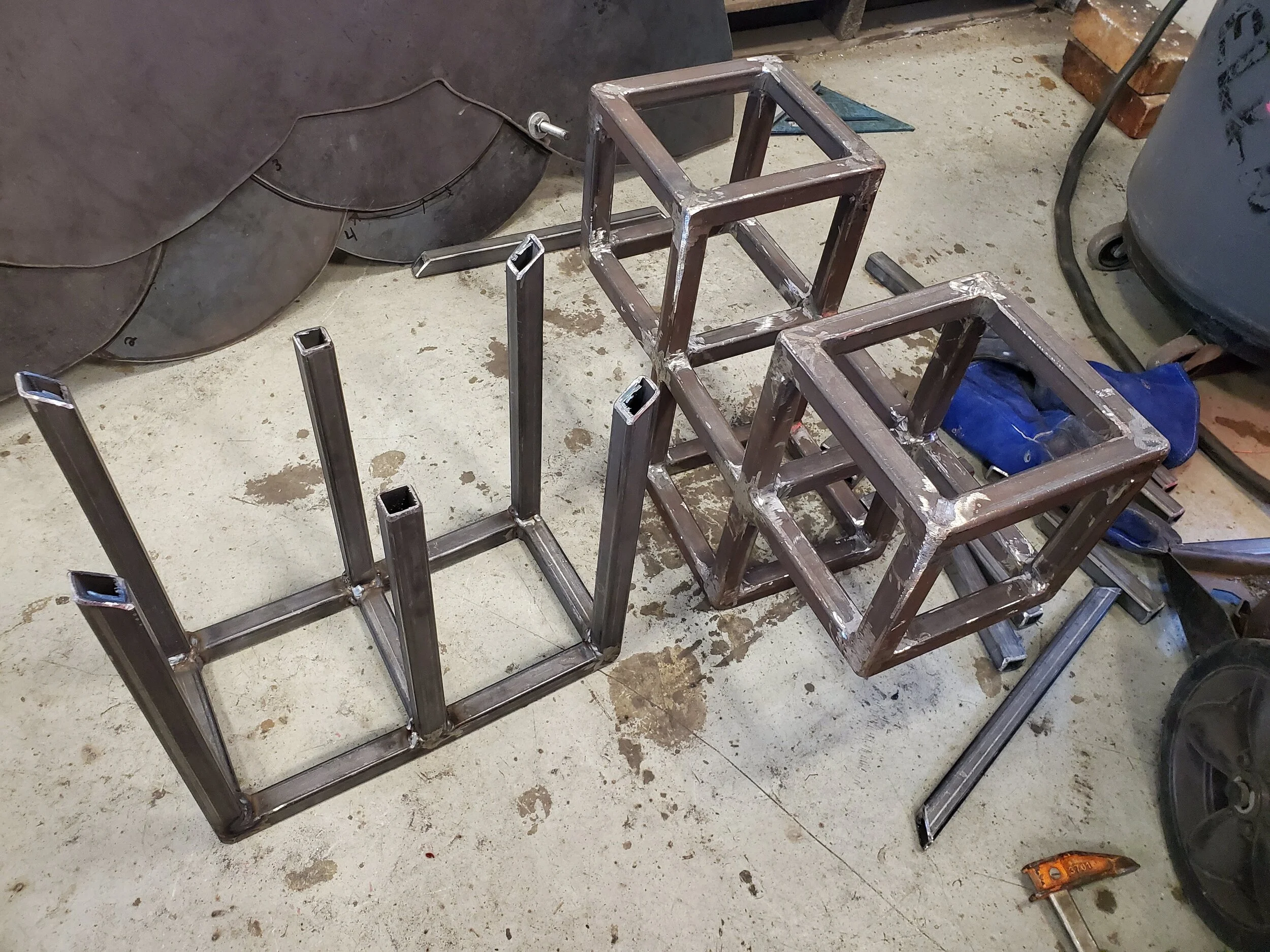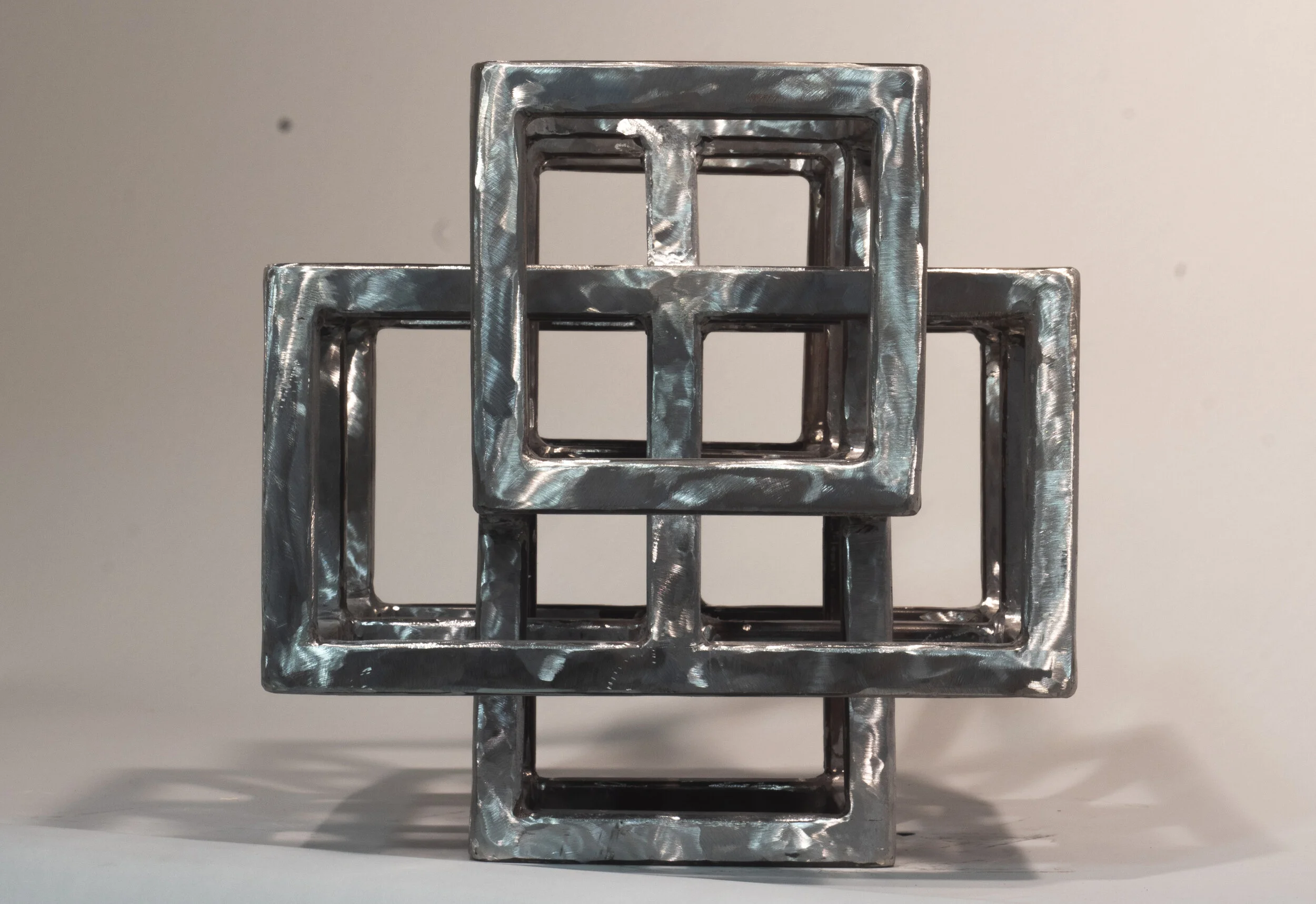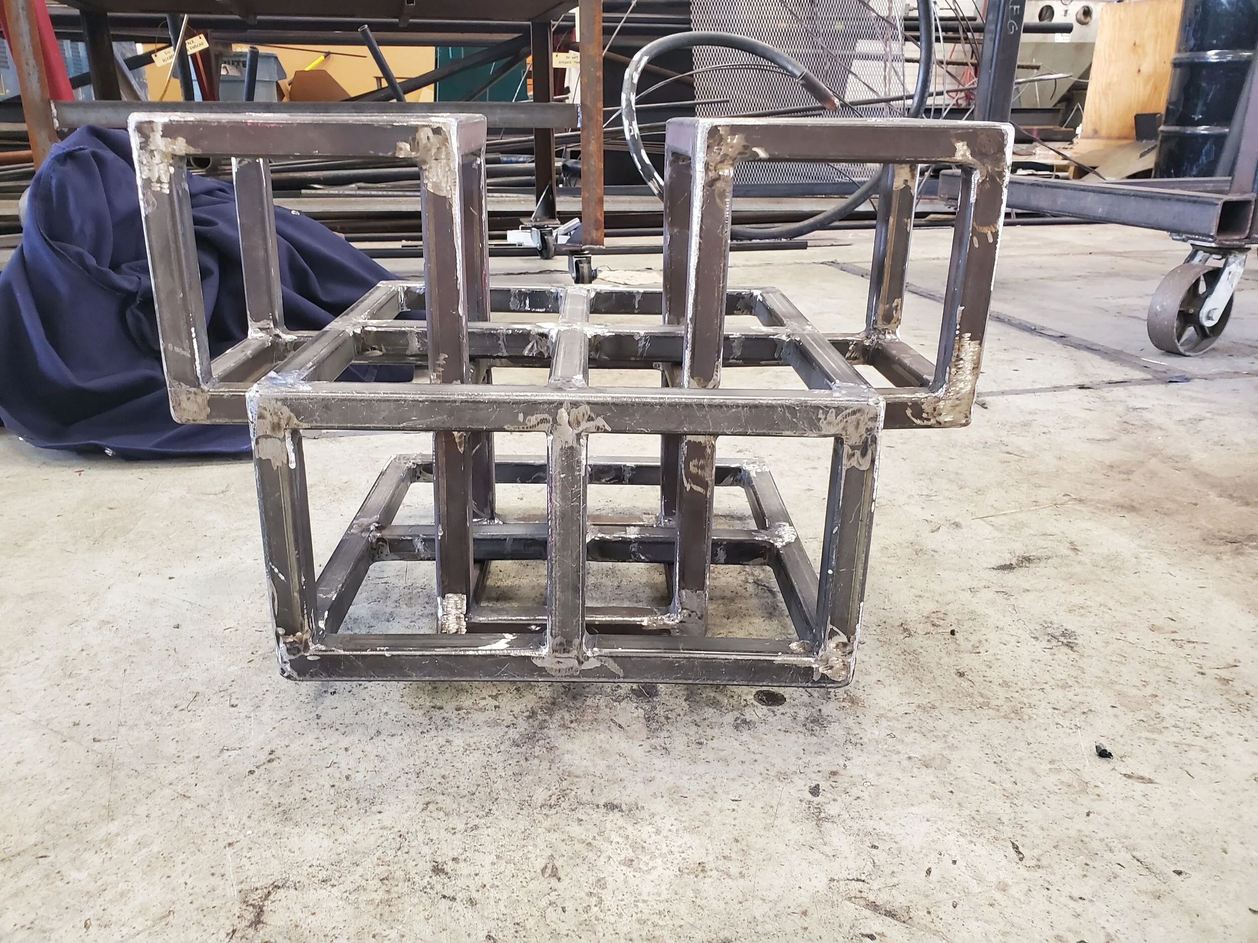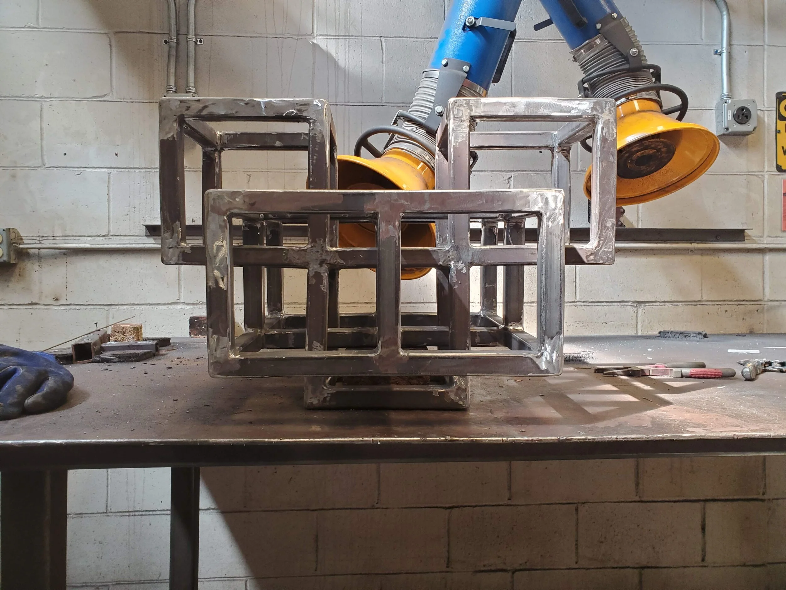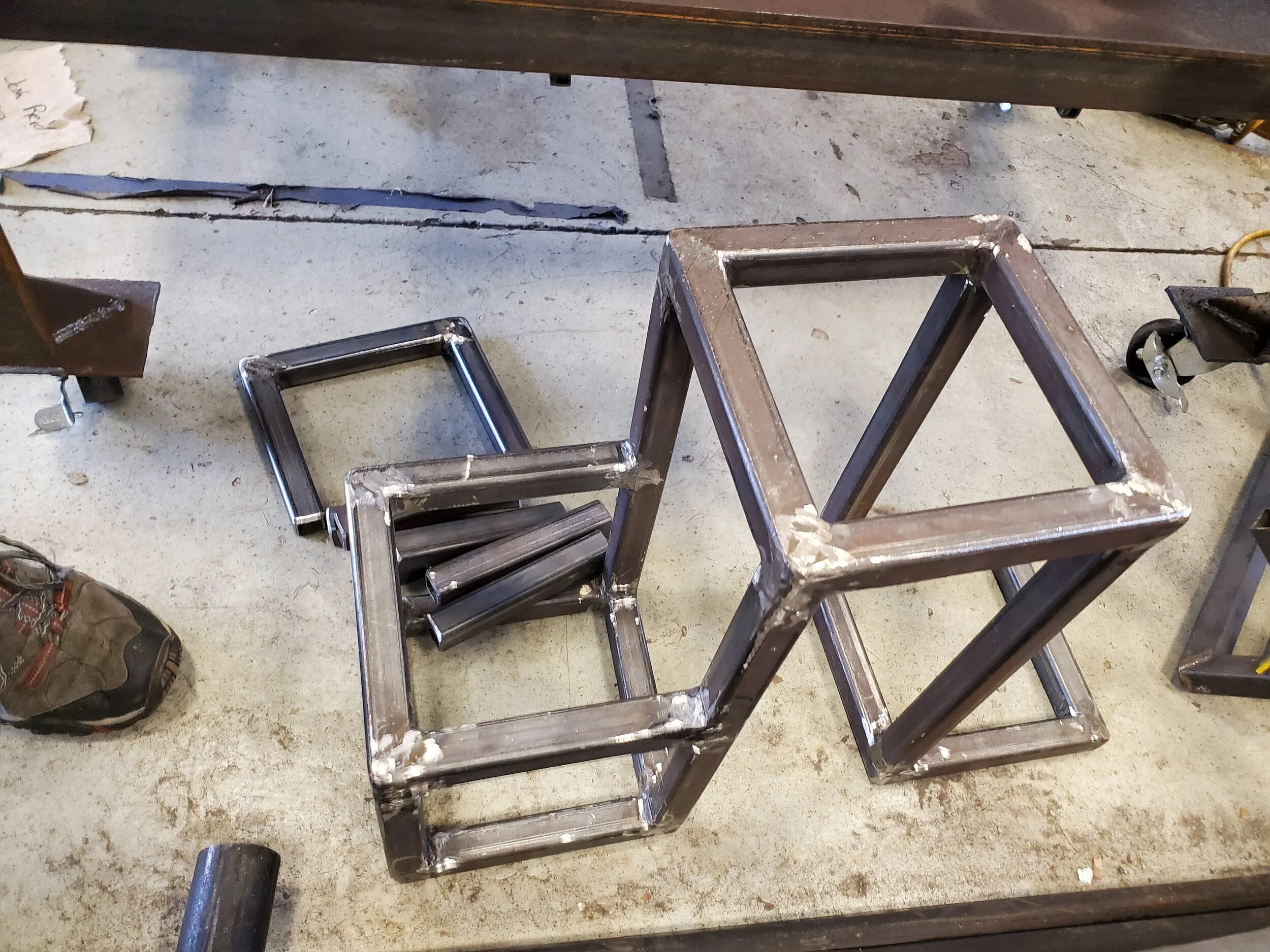 I started with two ideas in my head the first being a fully functional Skateboard, but my teacher advised that the engineering needed may be a little too advance, so I went to my backup, a cube sculpture. I had two references in mind, one being a picture my dad sent me from a metal shop near him and a cube optical illusion both displayed below. I learned how to weld for this project and it was honestly an incredibly fun experience. At first I was having issues making clean welds, but halfway through the 3rd cube something clicked and I started zipping away. I started with a 3D model made in Fusion 360, then sketched out each piece needed, with measurements, on paper. After doing the math I discovered my original larger version would have costed well over $100 and that is pretty out of my broke college student budget. So I halved the scale and it was more affordable, but I still wanted it to be as big as I could afford. After several calls to Scott Bolt, I got prices for different lengths and sizes and I built three or four more models in Fusion 360 to see a “realistic” version of my idea. I wanted to remain chunky but balanced so after my original 12 inch design I fell on 8 inch cubes with 1 inch square tubing, 1/8th inch thick because I wanted room to mess up, just in case. I rented a truck to pick the metal up because I was afraid I wouldn’t be able to fit in my car, I just didn’t do any math in my head and could have easily fit 8, 6 foot tubes in my car. I knew I could fit the Tubes in my car because I did it to take them to school, so that was a very wasted 60 dollar addition to the budget.