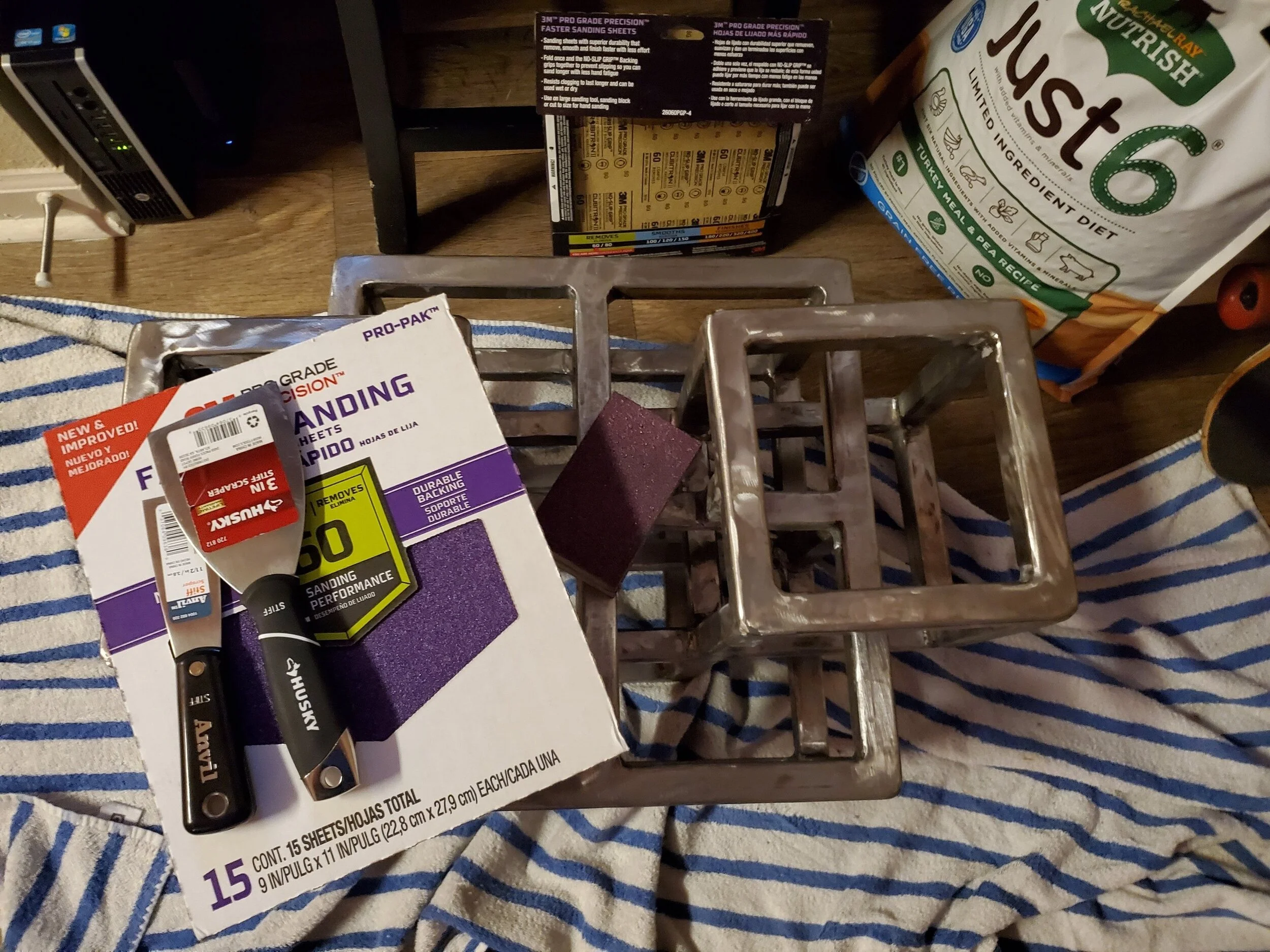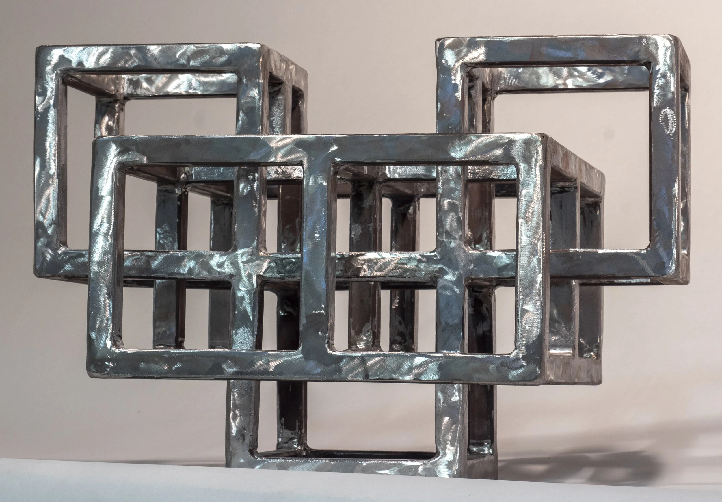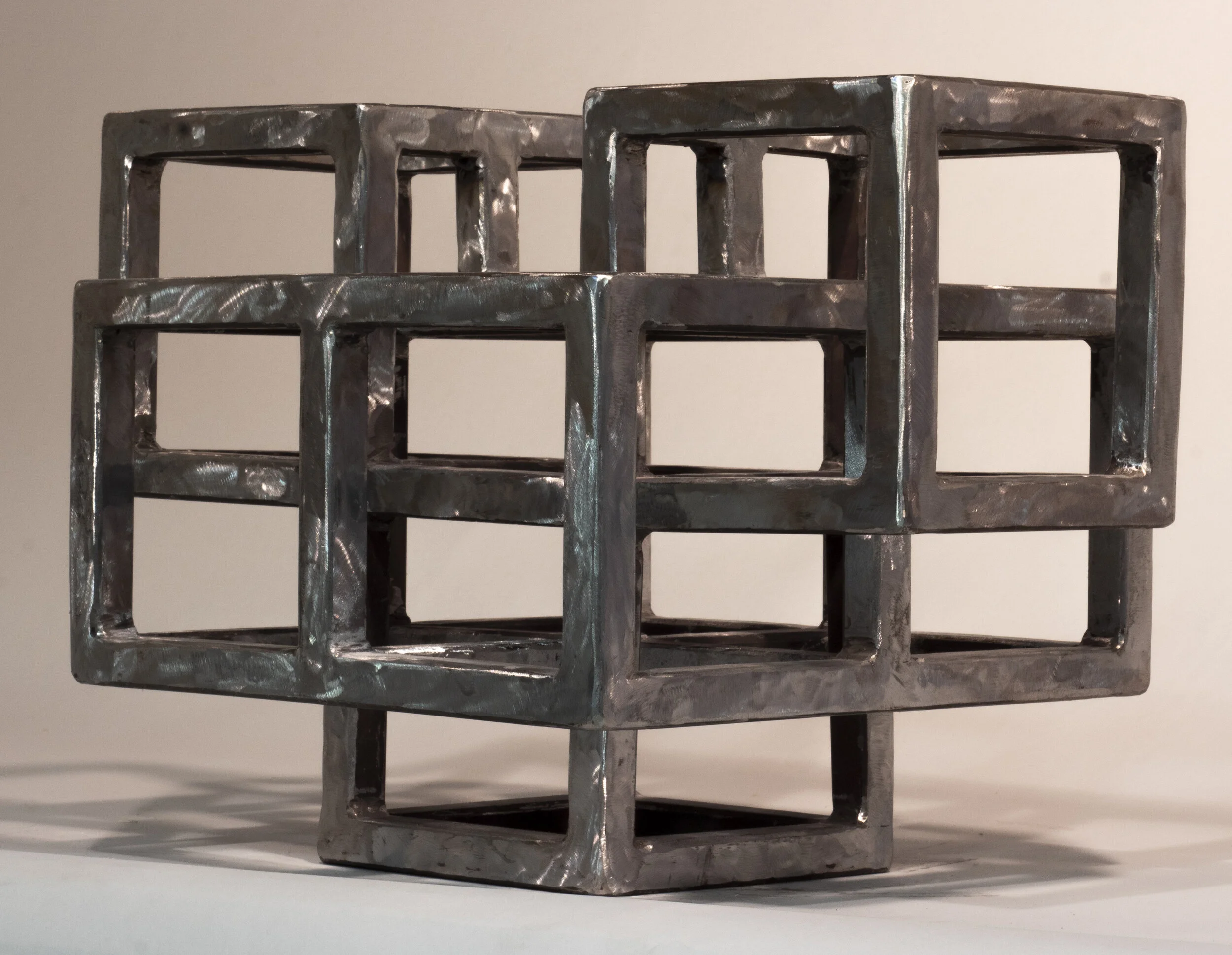 You’d think the day I combine the cubes and clean up all the sides I’d take a lot of pictures, you’d be wrong, my phone died after I took one picture of the complete form which I will give you. So without pictures I’ll describe Day 5’s progress. I arrived at 7pm for lab hours and spent hours grinding and brushing the metal to get the finish on almost every pieces of metal I could reach. I then squared up the two attachment points, welded them to the 4 cubes, flipped the sculpture over, squared the cubes to each other, and welded the final welds of the piece. I then proceeded to grind and brush for a couple more hours, since the welds took me less than 20 minutes. I used a wire brush to clean burn marks, hand files and the grinder to clean corners, and the brush to clean as many flat areas as I could reach.