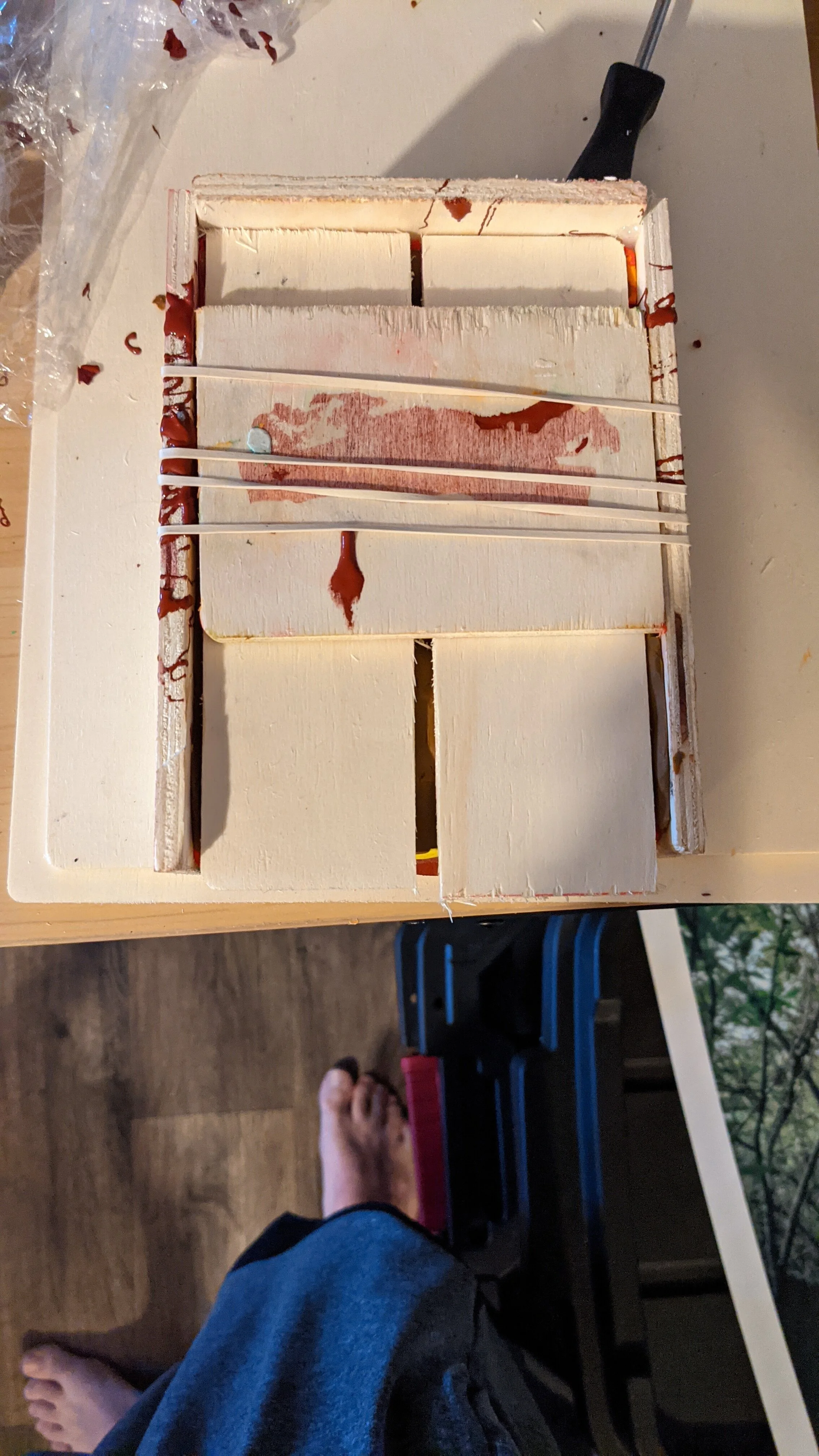 I had to go to my Dad’s house and use his chop saw to make this little box to hold my snowman and then I realized I had to pack the box with clay. So in order to mix my clay sculpture with clay in the box I gently wrapped him in plastic wrap and trimmed the edges.